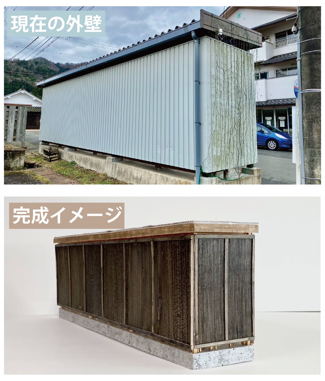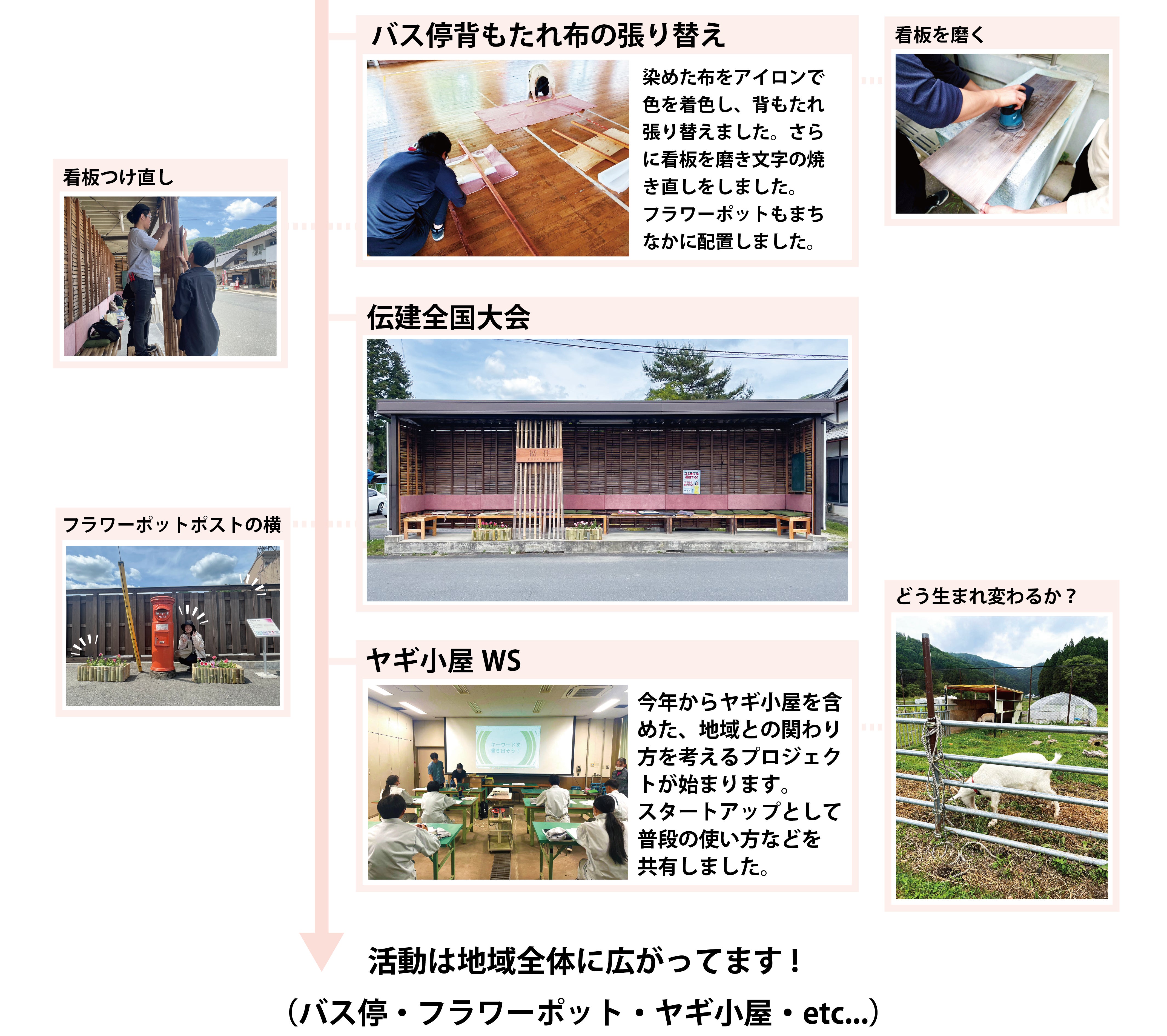 今年度はバス停「福住」待合所の外壁の改修と並行し、篠山東雲高校のヤギ小屋を地域の方にも気軽に立ち寄ってもらえる憩いの場となるよう共にデザインし、一緒に施工を行う予定です。