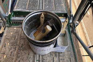 おすすめの段取りです。 Kモルタルの硬化剤の空き缶にエポキシシンナーを適量入れ、ユニエポの空き缶の上部を皮スキで切り取ってユニエポを適量入れます。 ガムテープやパイオランテープで巻いて固定しましょう。 ユニエポ用の刷毛1本、鏝洗いおよび刷毛引き用の刷毛1本、角を作る際にカットしたり定規代わりにも使える金鏝1本、Kモルタル専用鏝ポリ鏝1本を準備してください。
