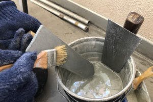 まず、エポキシシンナーをKモルタル専用鏝に塗布します。 このひと手間で、Kモルタル充填時の滑りが良くなり、表面をきれいに仕上げることが可能となります。 ただし、Kモルタル専用鏝をエポキシシンナーに長時間浸したままにするのは避けてください。