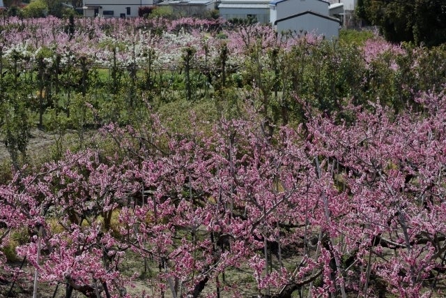 桃の花の季節には、辺りの緑の部分が一面桃色に染まり、果物だけでなく、その美しい景色を目当てに多くの観光客が訪れます。