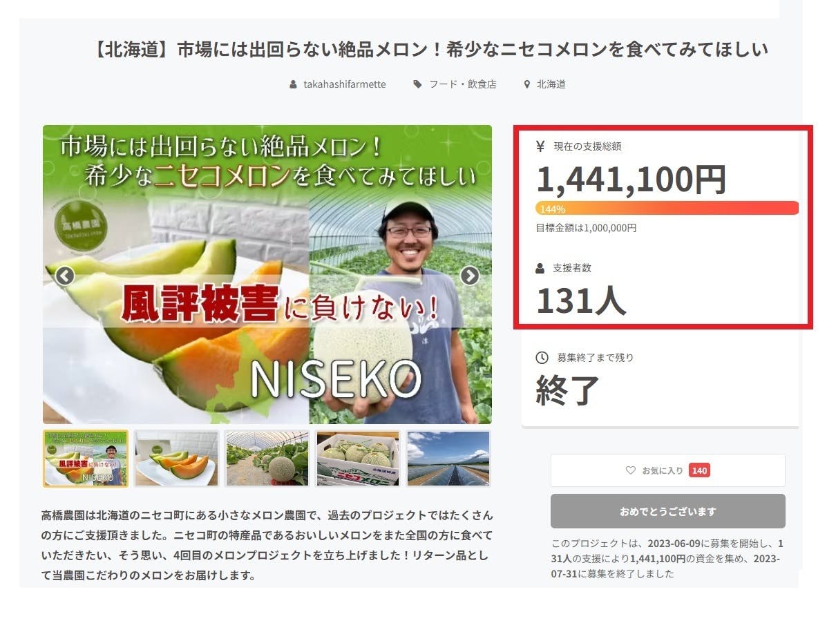 2023/08/01 16:49【プロジェクトが終了しました!ありがとうございました!】北海道ニセコ町の高橋農園です。6月9日からスタートしたクラウドファンディングですが、7月31日に終了することができました。ご支援いただいた方には、メッセージにてご連絡させていただきましたが、改めて活動報告でもご報告させていただきます。今年のニセコメロンプロジェクトは、支援者の方が131人、支援総額は1,441,100円となり、目標金額の1,000,000円を達成することができました。プロジェクトの途中で、蘭越町の蒸気噴出問題が起こり、支援者の皆様には大変ご心配をおかけしました。順調だったプロジェクトも、伸び悩んでしまいましたが、皆様からの応援メッセージやコメント、本当に心が温まりました。ここまで頑張れたのも、皆様のおかげです!本当に本当にありがとうございました!現在リターン品の発送準備をすすめており、リターン品の発送を開始しましたら、また活動報告でアップさせていただきます。少しでも早く皆さまのもとへリターン品をお届けできるよう、頑張ります!!プロジェクト開始からの52日間、本当にありがとうございました。高橋農園 高橋悠太 もっと見る