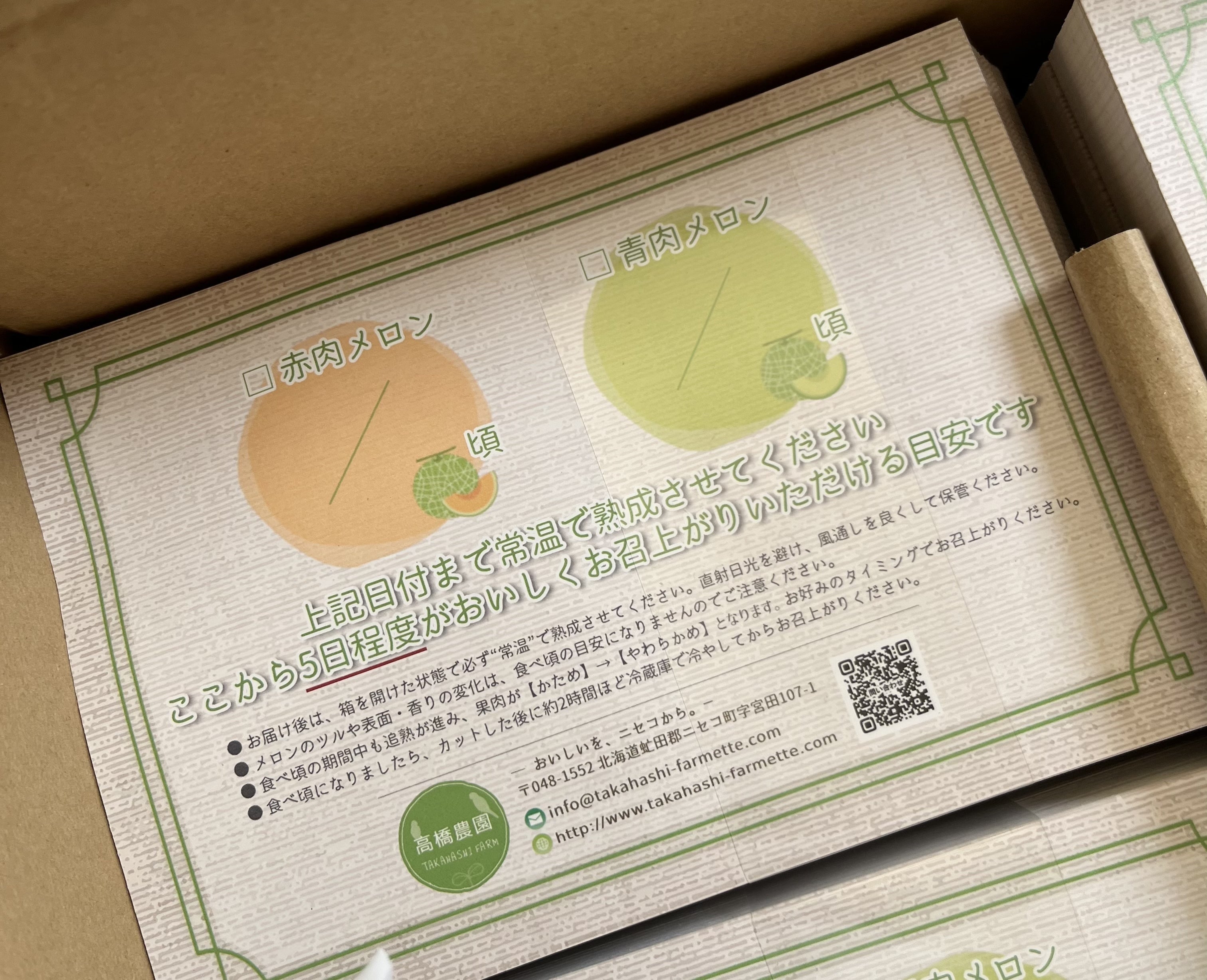 メロンの保存方法や、食べ頃に関するお問い合わせをよくいただくため、より分かりやすくなるようにと、今年からこちらの紙を箱に入れて発送しております。食べ頃の時期や追熟の仕方など、こちらを参考にしてみてください!