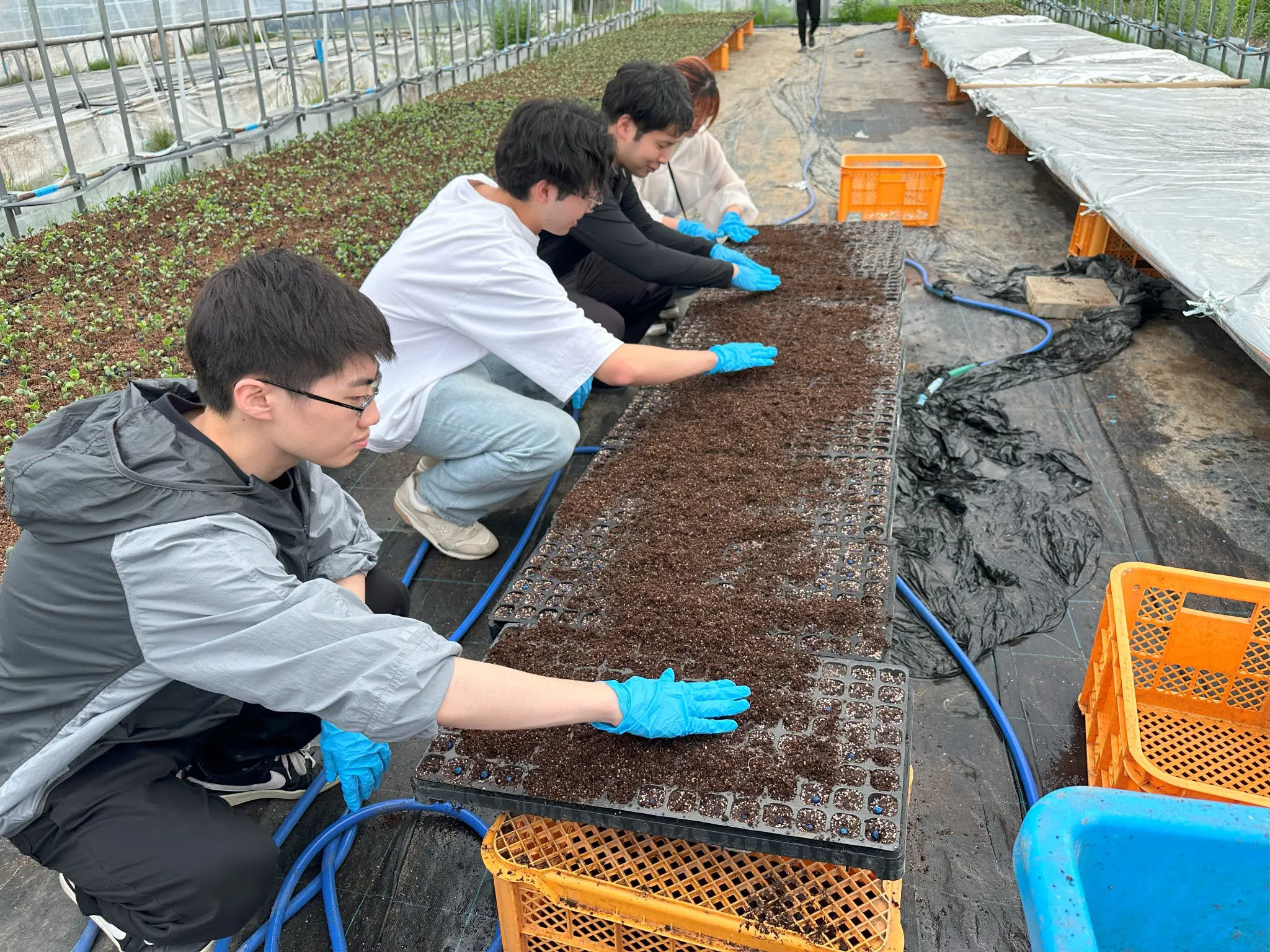 私たちは黒枝豆の理解を深めるために実際に農家さんを訪れ、種まきを体験しました。セルトレー(下の写真)に種を入れ、ビニールハウスに収納するところまでを行いました。体験したのはその一部だけでしたが、黒枝豆への愛着が生まれ、このプロジェクトをなんとしても成功させたいという思いが募りました。