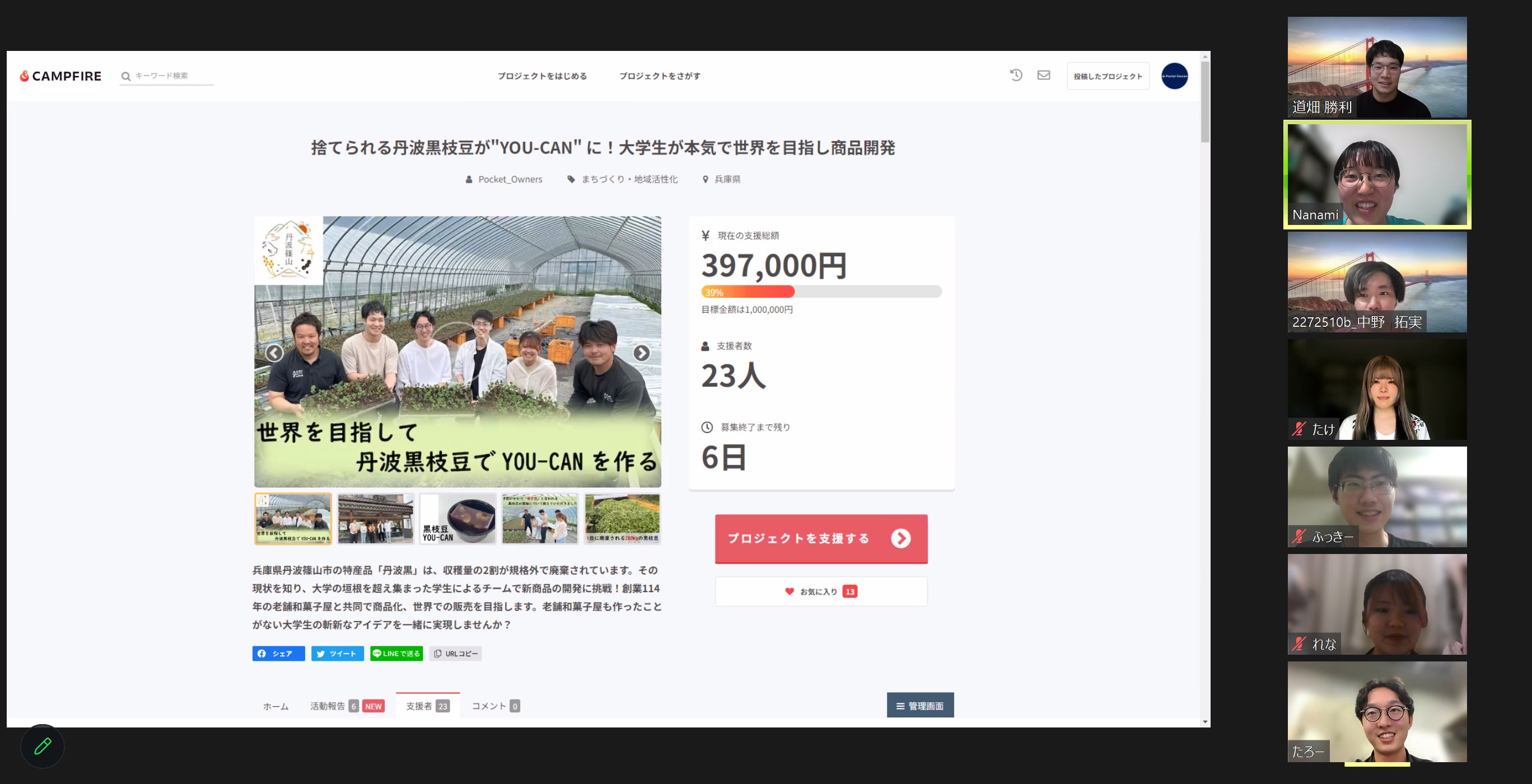 今週のミーティングには、チームメンバー5人(画像上から1、4~7番目)に加え、私たちのプロジェクトに興味を持っていた2人の学生(画像上から2、3番目)が参加してくれました!ミーティングの最後に写真撮影を行いました(7月25日(火)撮影)ミーティングでは、クラファンについて、今後のプロジェクトの進め方、アメリカでのマーケティング調査の仕方などについて議論を行いました。