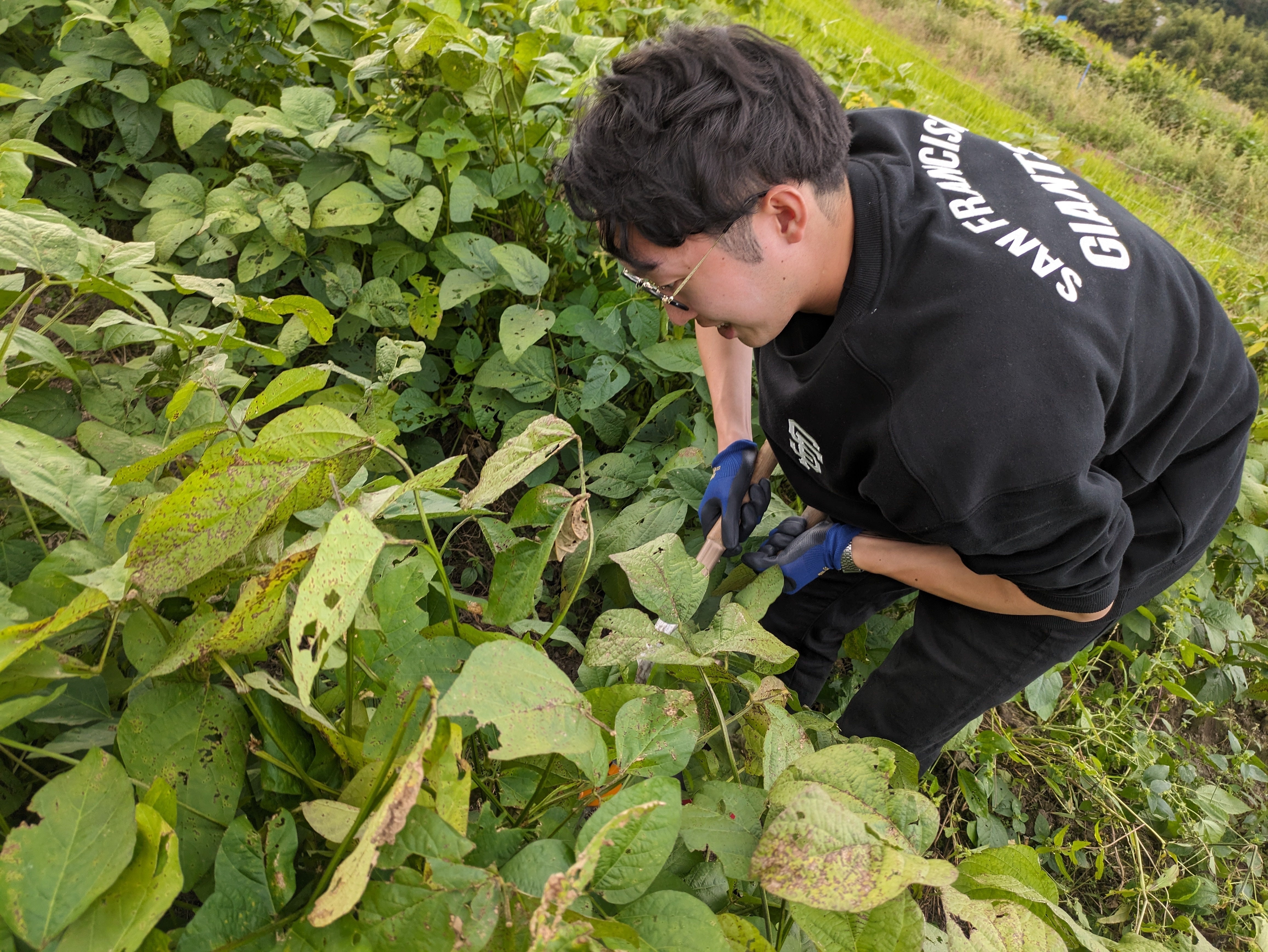 たくさんの黒枝豆が付いている株を探し、根本をハサミで切り収穫を行いました!