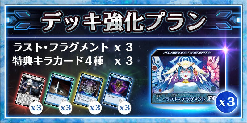 本製品「ラスト・フラグメント」3個と以下キラカードが3枚ずつ付属されます。