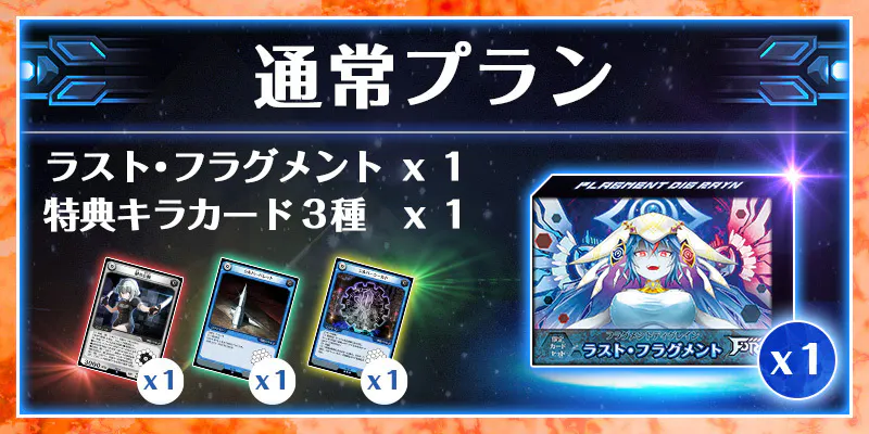 本製品「ラスト・フラグメント」1個と以下キラカードが1枚ずつ付属されます。