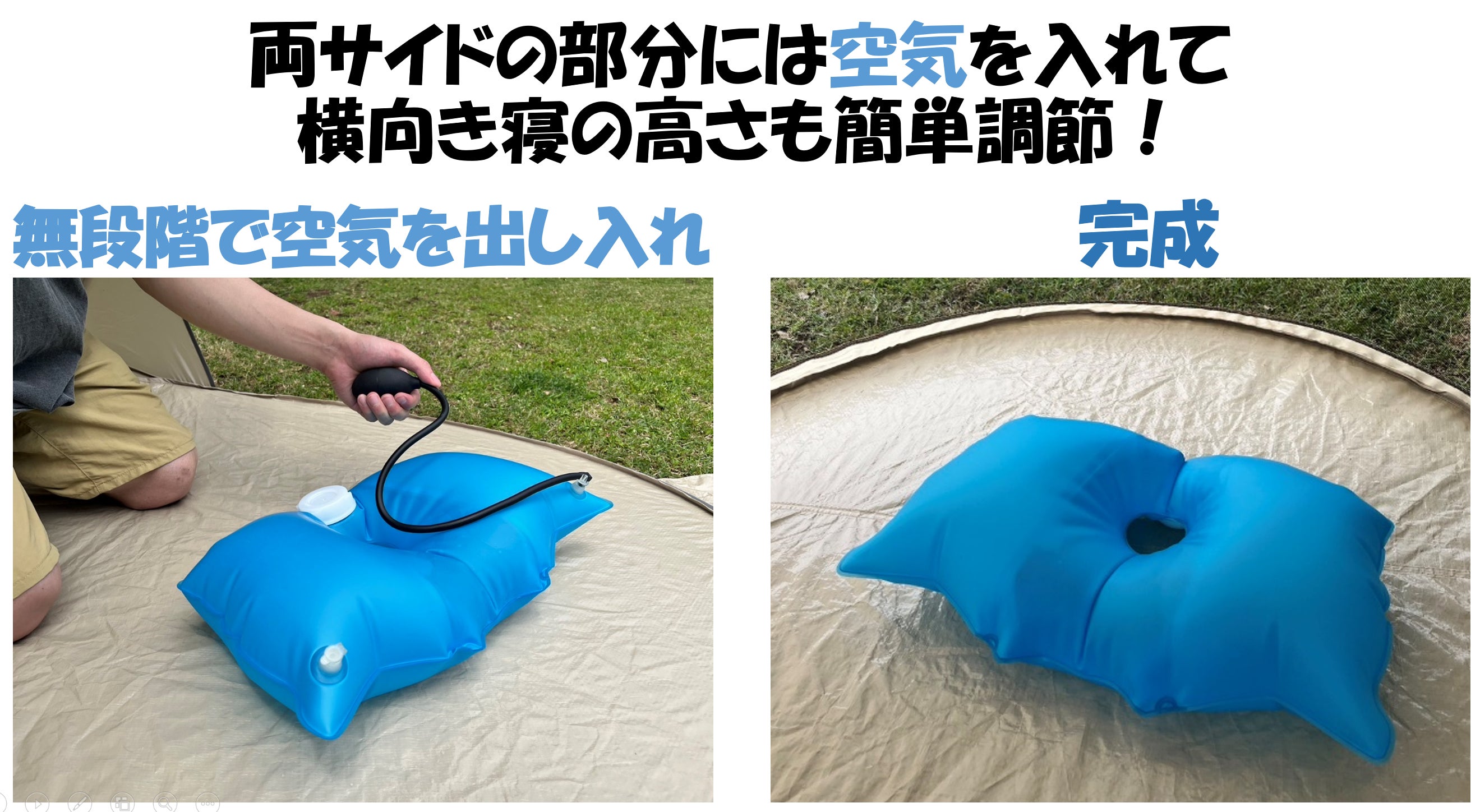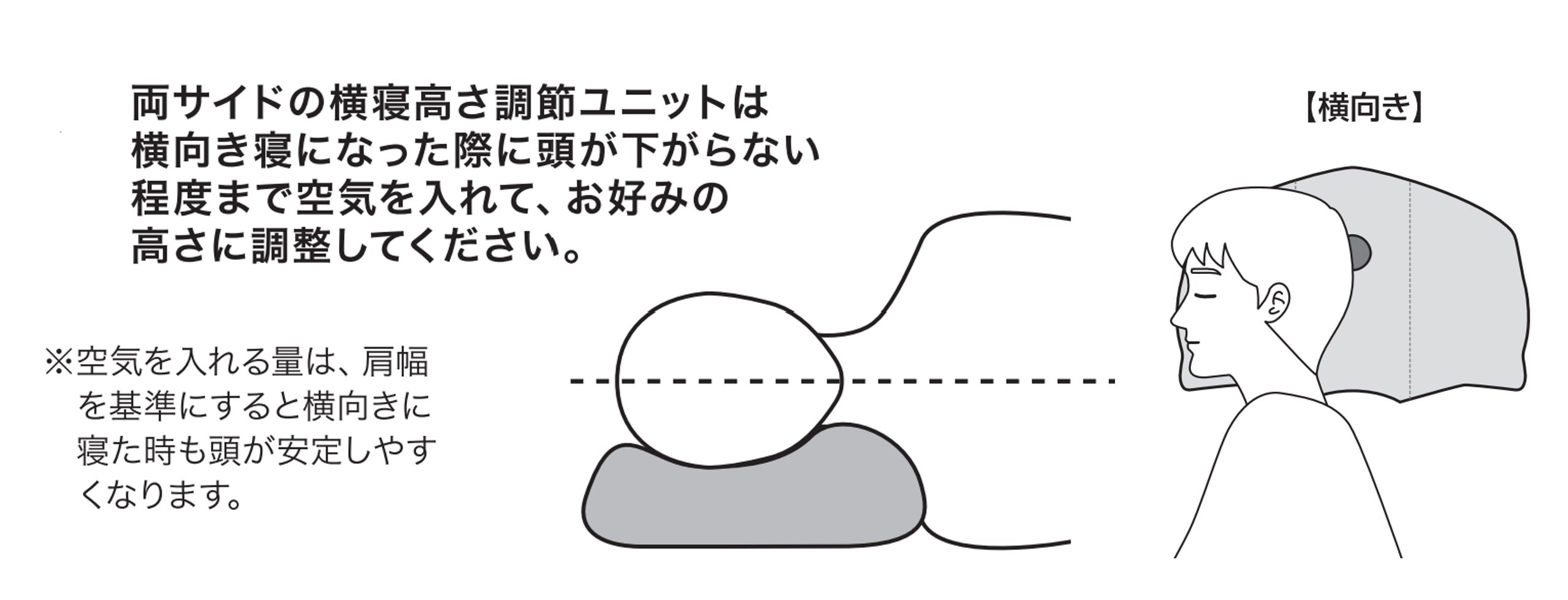 ●両サイドの空気の量で横向き寝の高さも、ご自身の肩幅や敷布団の弾力性に合わせて無段階調節が可能です。