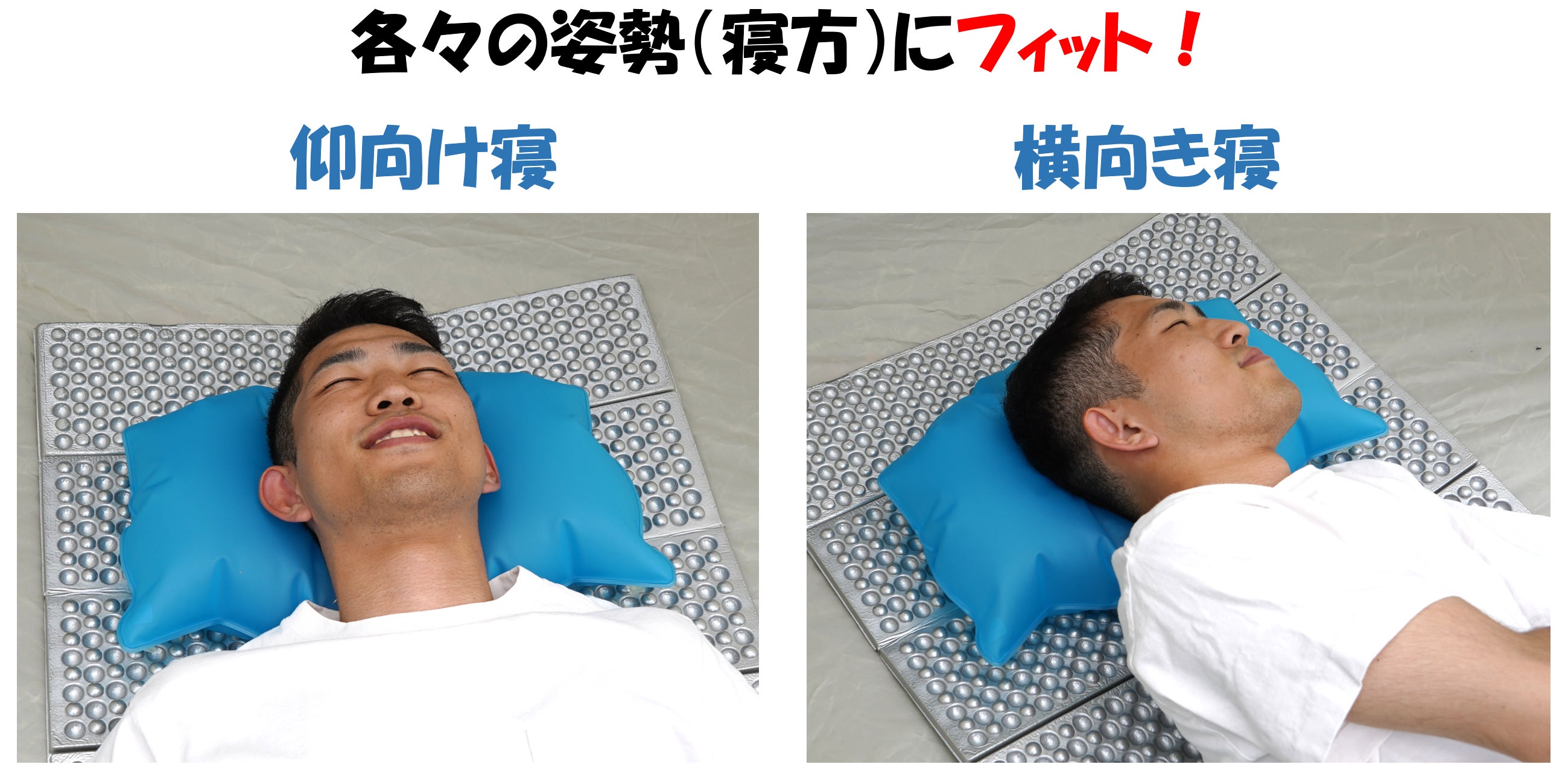 中央部のキャップから水を入れ仰向け寝の高さを調節します。横向き寝を顧慮した両側の部分は、空気栓からエアーを入れる事で、自身の肩幅程度に合わせて無段階調節が可能となり、頭が下がらずに良い姿勢(背骨と顔のに中心線が直線で繋がる姿勢)が保たれます。