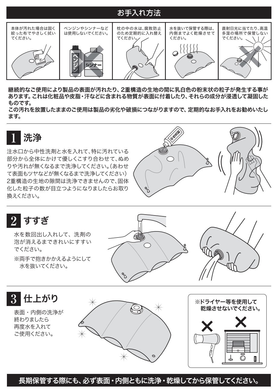 ※洗浄方法:水を入れ替える時には、S-sleepの表面に付着した汗や皮脂を中性洗剤で洗い落して下さい。