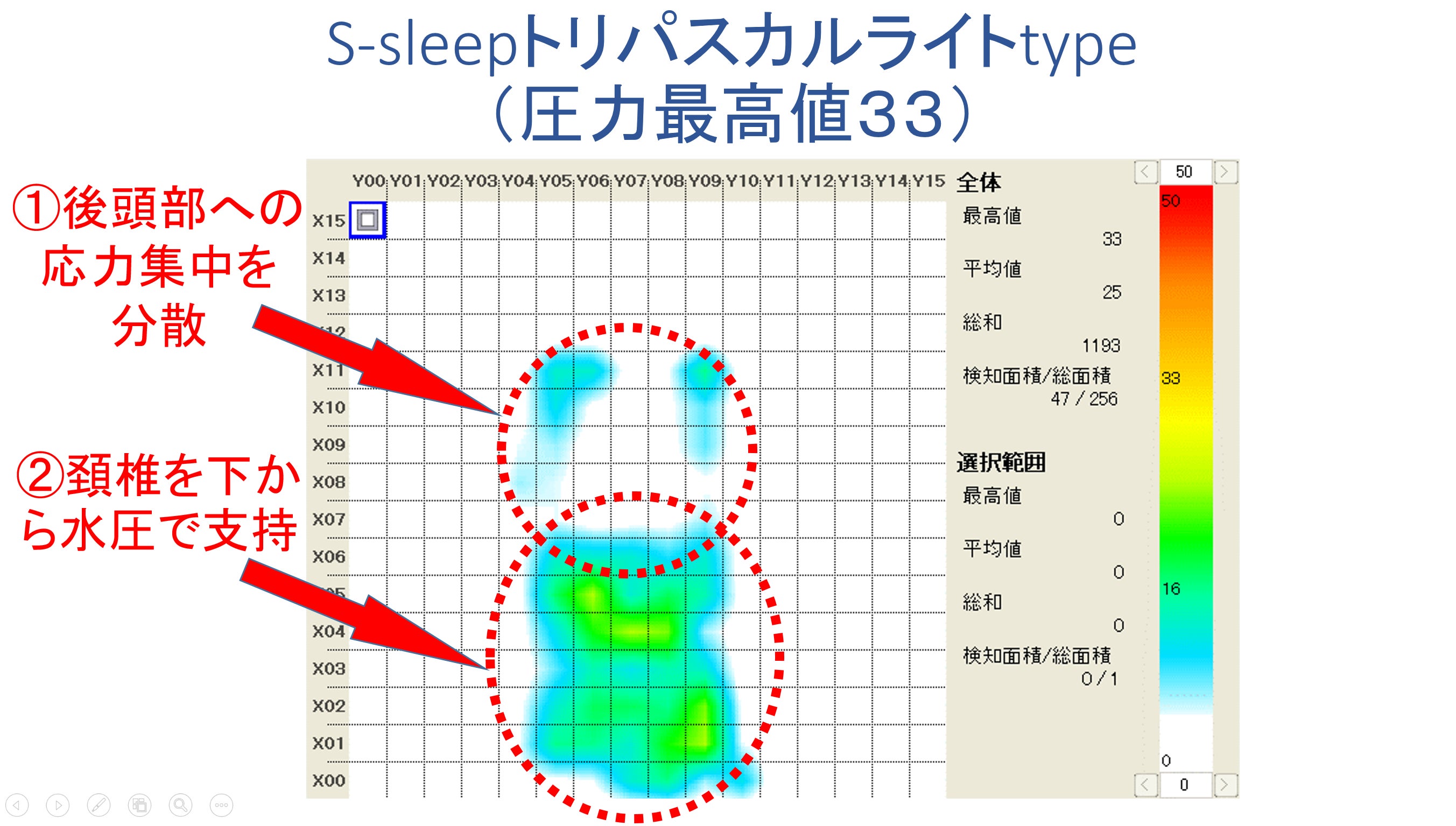 ●上記の実験からS-sleepを開発を進め、再度トリパスカルライトtypeで体圧実験を実施しました。