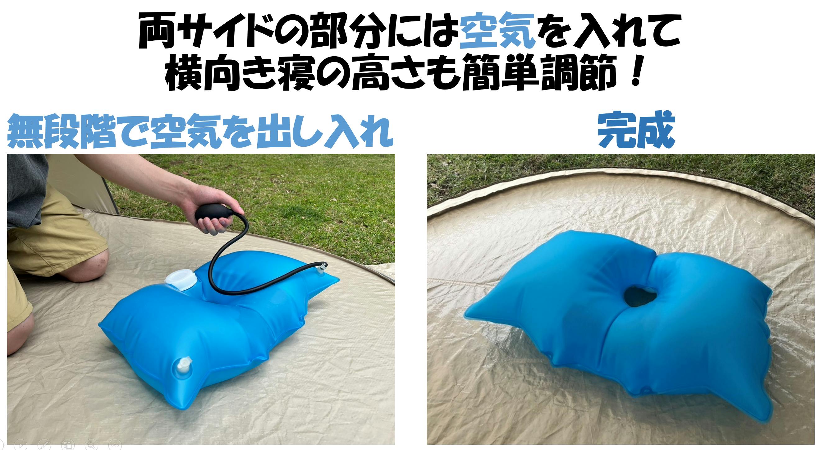 ●両サイドの空気の量で横向き寝の高さも、ご自身の肩幅や敷布団の弾力性に合わせて無段階調節が可能です。