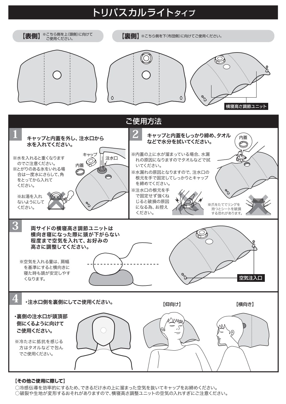 ※1か所から水または氷水を入れた後に、3か所に空気を入れて仰向け寝と横向き寝の高さ調節が可能なタイプです。