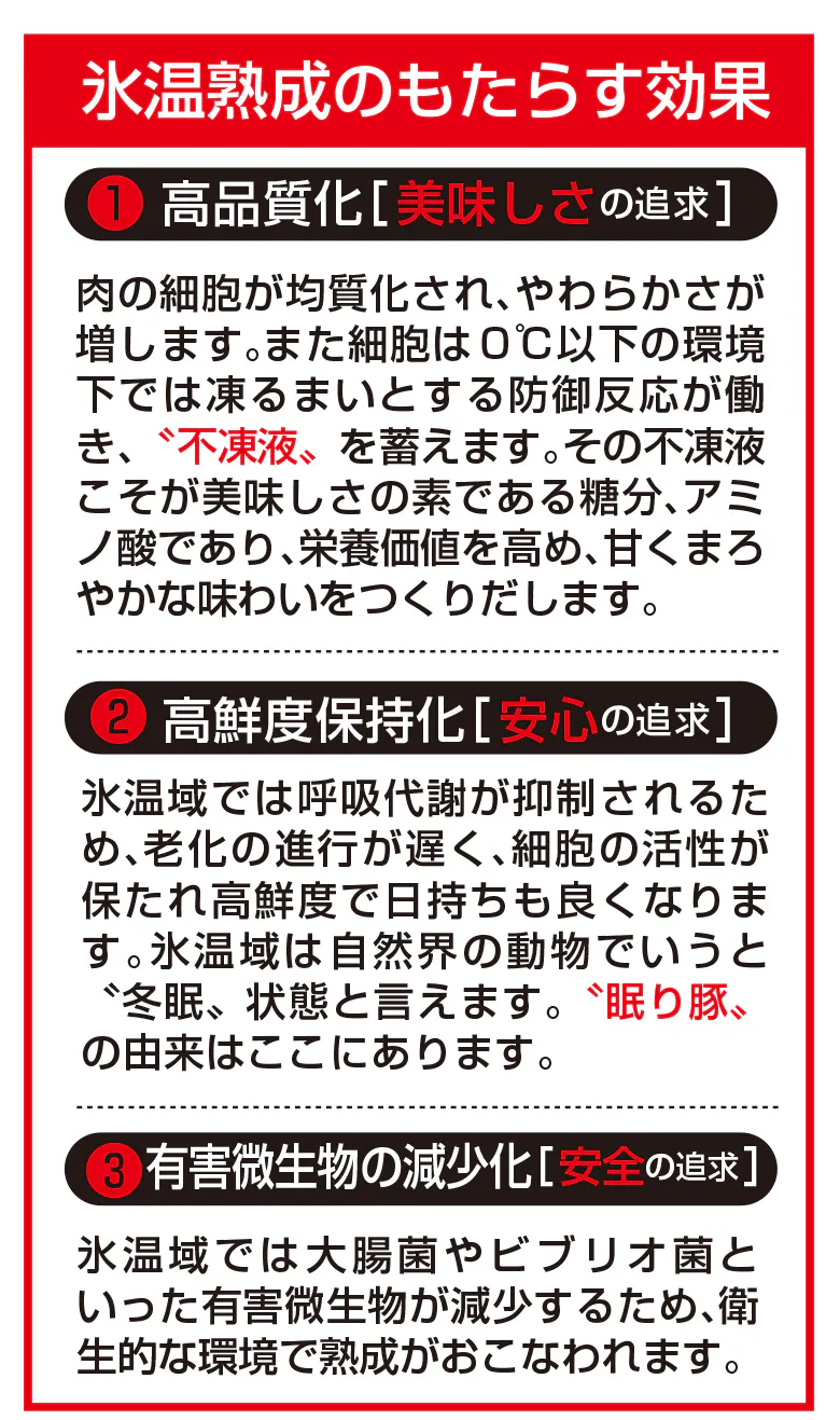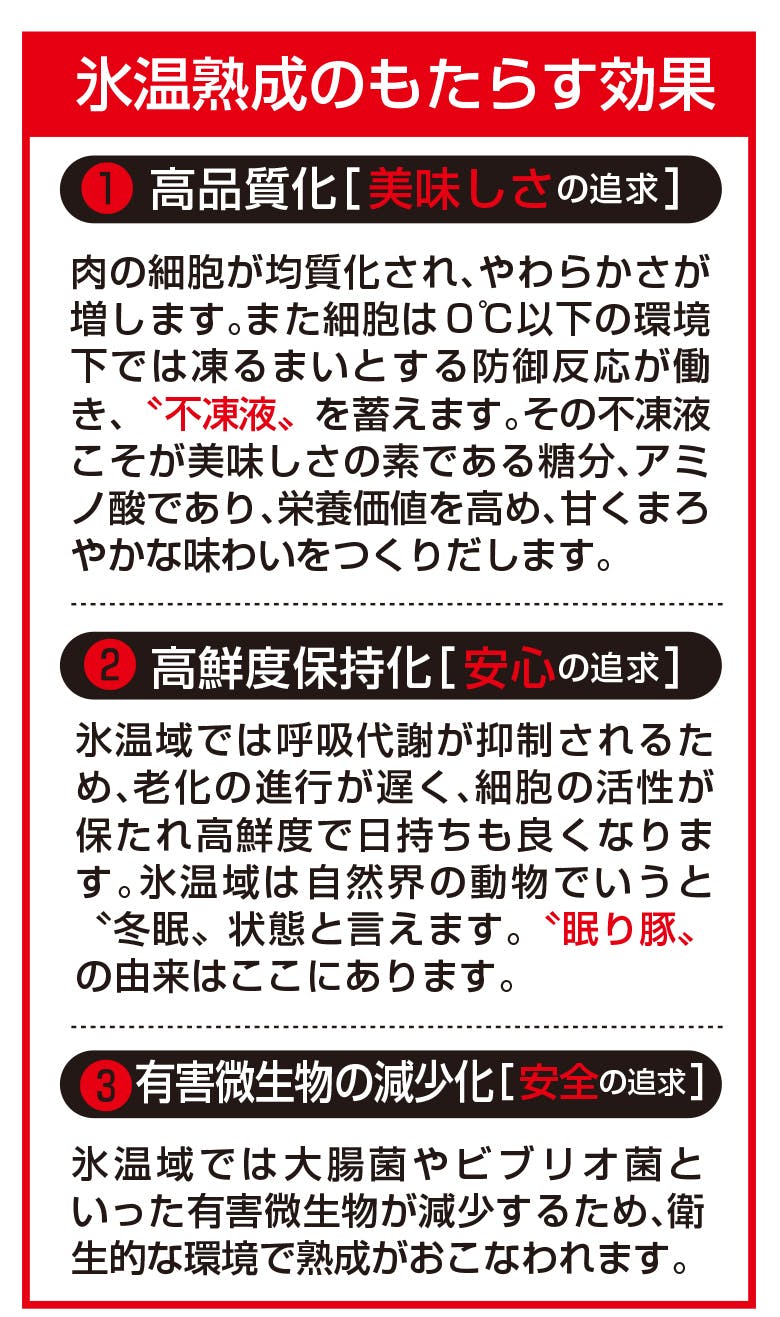 その原理をも とに生まれたのが「氷温熟成®︎」。摂氏0℃以下でも凍らずに食品が生き続ける温度域「氷温域」になると、凍るまいとする防御反応よって旨味が増し、甘くまろやかな味わいになります。また、呼吸代謝が抑制されることによって、細胞の活性が保たれることで高鮮度を維持することができるのです。岩野精肉店では、社団法人氷温協会と共に榛名ポークの旨味を最大限引き出すのに最適な氷温域と熟成期間を繰り返し研究することで2011年に”氷温熟成®眠り豚はるな”を完成させました。