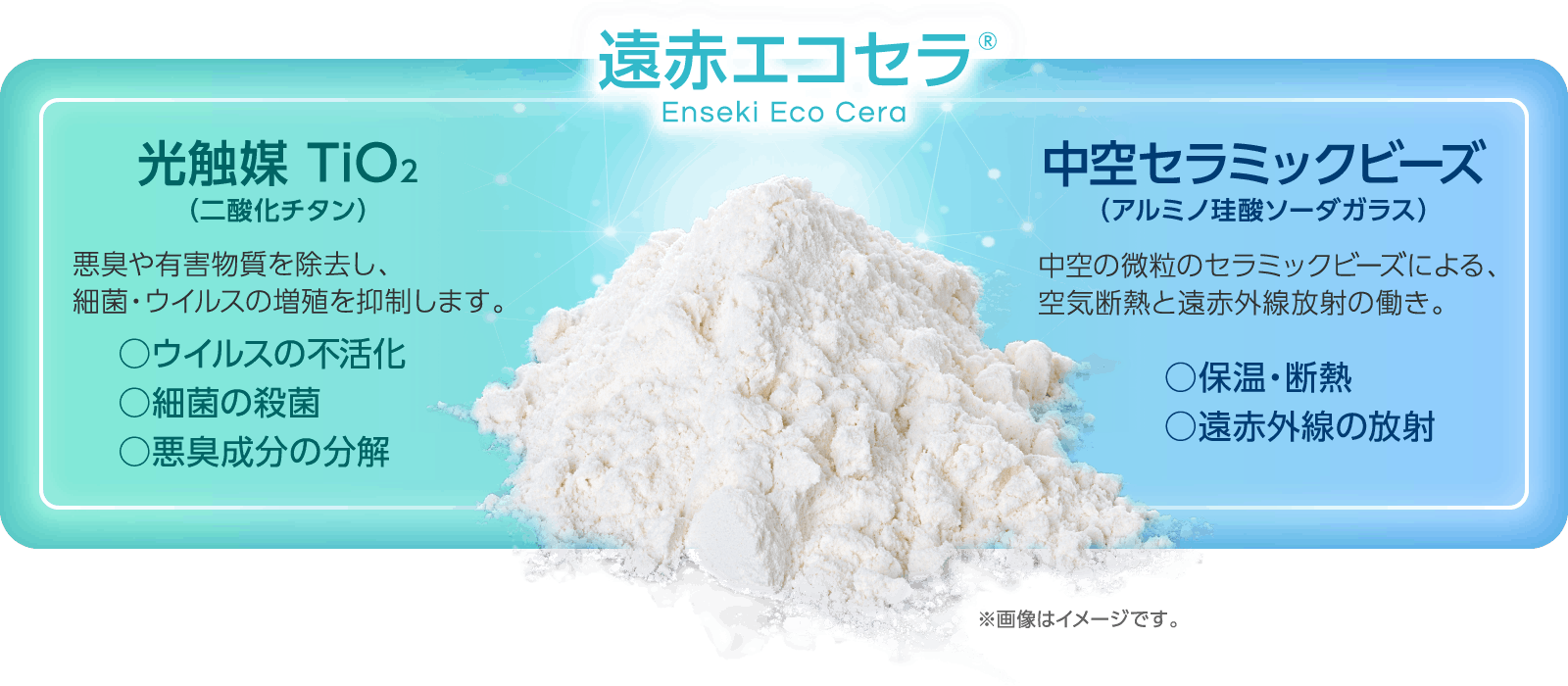 遠赤エコセラは、光触媒と中空セラミックビーズの特徴を併せ持つ、様々な用途へ応用が可能な素材です。