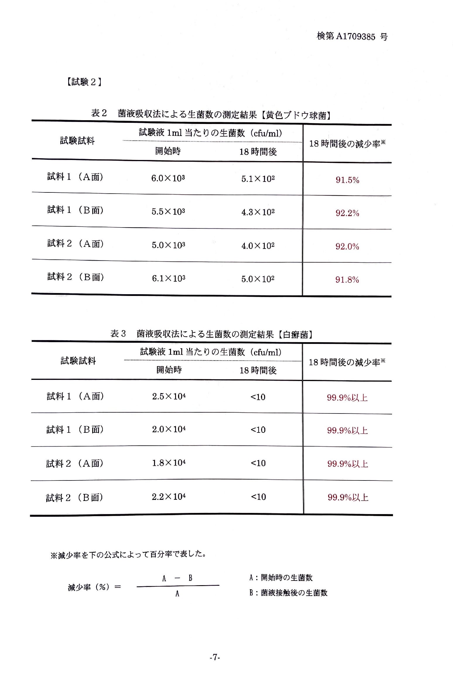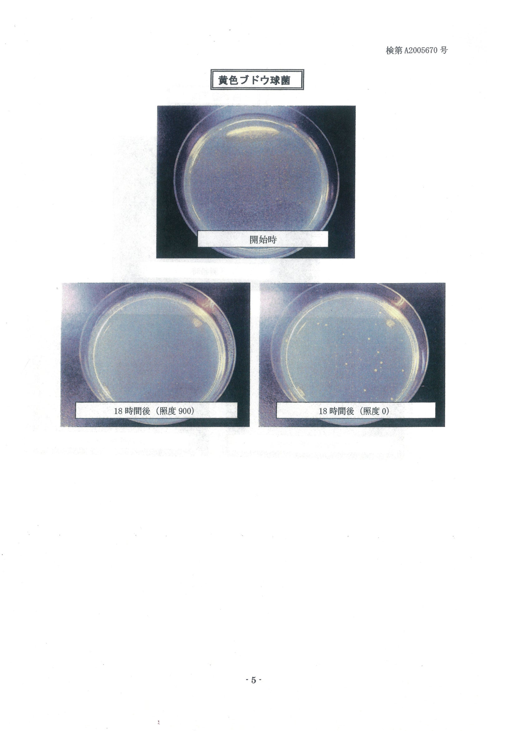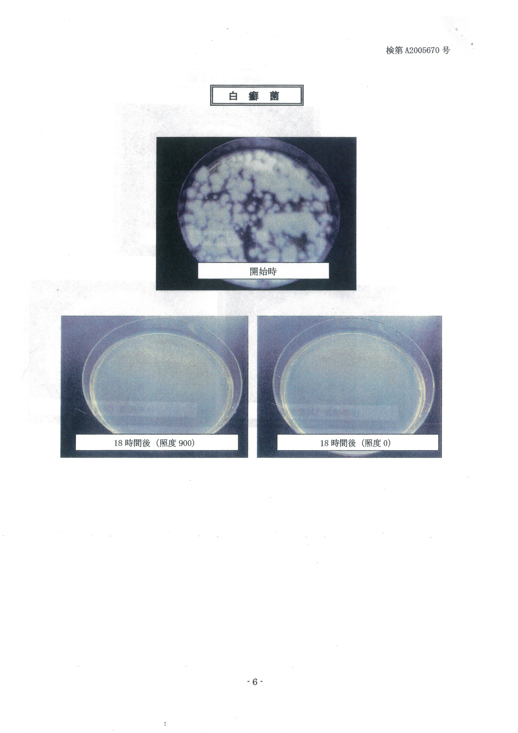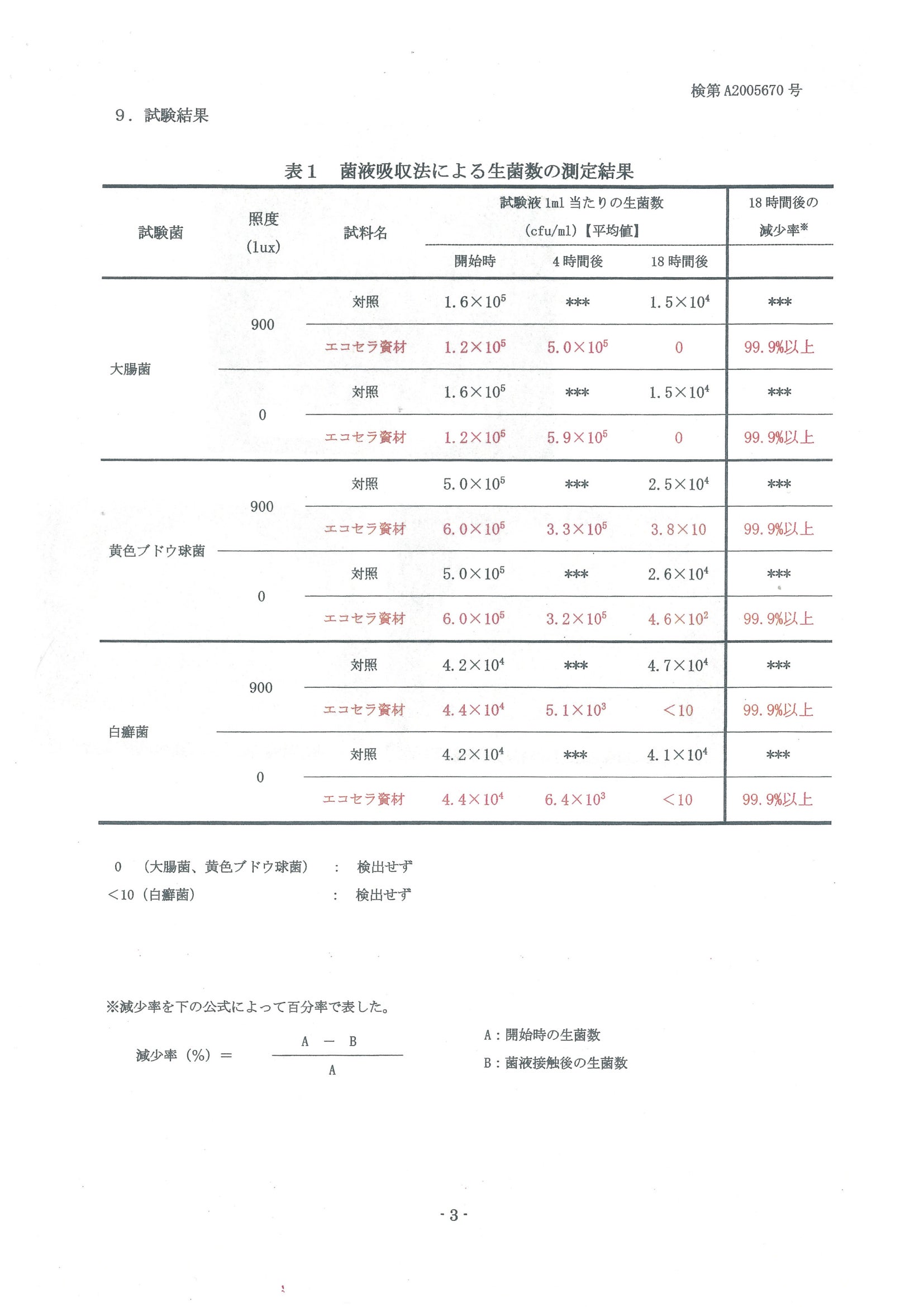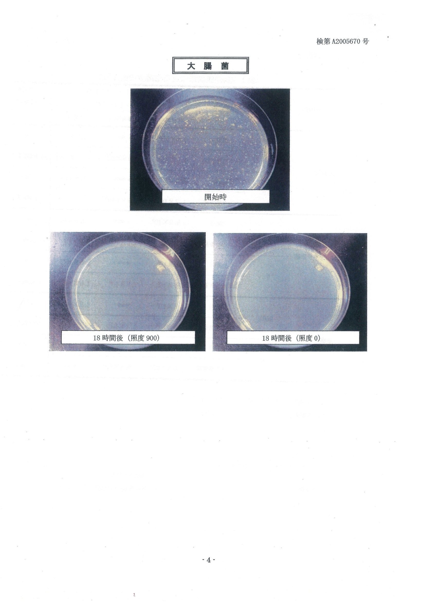 大腸菌(食中毒など)・黄色ブドウ球菌(悪臭の元)・白癬菌(カビ)に対し18時間で99.9%