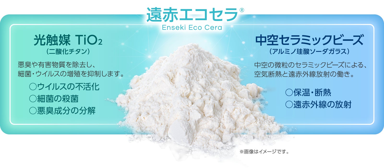 遠赤エコセラは、光触媒と中空セラミックビーズの特徴を併せ持つ、様々な用途へ応用が可能な素材です。