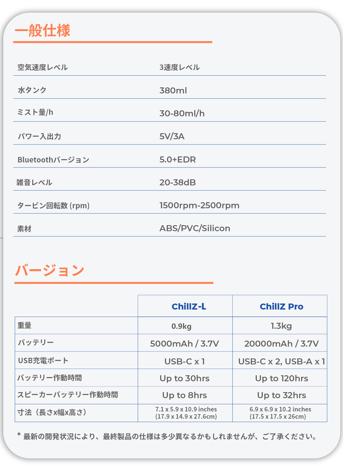 20000 mAhのリチウムバッテリーの大きさはどれくらいですか?それは最新のiPhone 7台分と同じくらいの大きさです!これは、ファン、霧、スピーカーを一日中動かすのに十分な容量です。余分な電力を有効に利用できるように、他のUSBデバイスを接続してChillZ Proをパワーバンクとして使用することもできます。