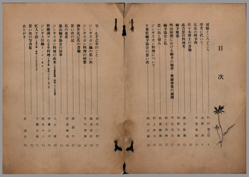 後者の冊子は、下総御料牧場が地域にもたらした遺産であり、ご当地グルメとして現在まで地域で愛されている羊肉料理「ジンギスカン鍋」の地域史を綴った、とても希少な冊子の復刊頒布になります。元々の発行部数が少ない上、発行者である「遠山緬羊協会」は既に解散しているため再版の途もなく、関係者のご家族の手元に残る既存の冊子も劣化しています。私が関係者のご家族から頂いたものも、ページが一部欠損した状態で、ホッチキス綴じも完全に錆びていました。下の写真は、綴じを解体してスキャンした表紙と目次・奥付ページです。