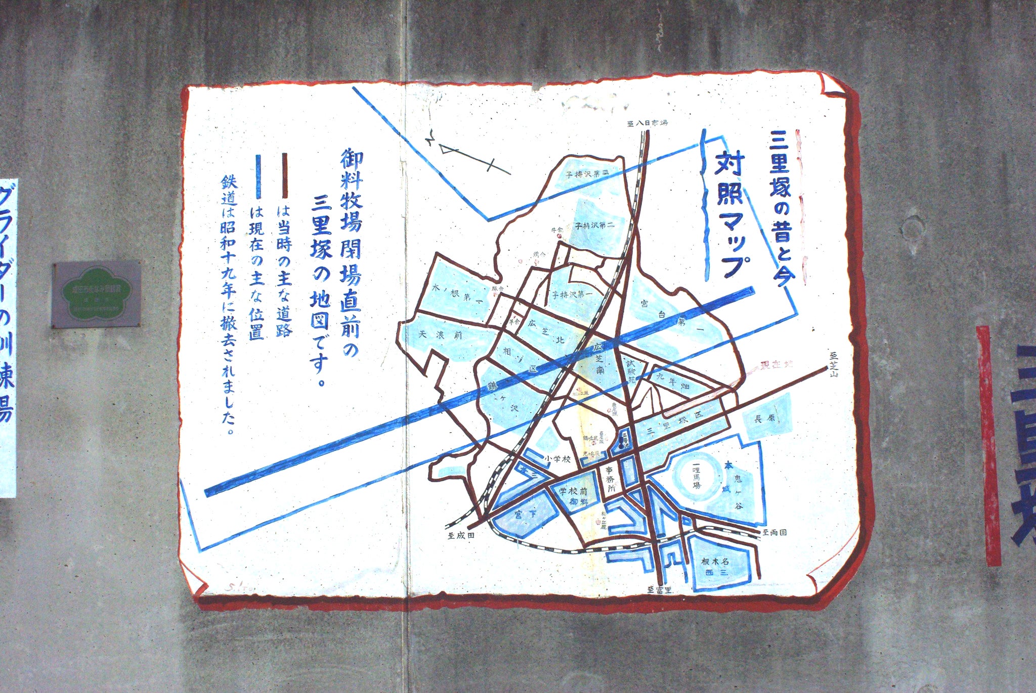 三里塚地区の壁面に描かれた地図。地図の隣には牧場在りし日の絵が並ぶ もっとも、先に述べたとおり、牧場はすでに半世紀前に閉場し、今では日本の空の玄関である成田国際空港がその地域の中心となっています。空港関係の仕事に就く人が増える一方、牧場のことを知る人はどんどん少なくなっています。私が移住してからお話をお伺いした方もここ数年で鬼籍に入られ、直接の経験・記憶として牧場を知っている世代がいなくなるのはもう時間の問題です。現状のままでその時を迎えれば、牧場の存在は過去に忘れられ、やがて語られなくなるでしょう。