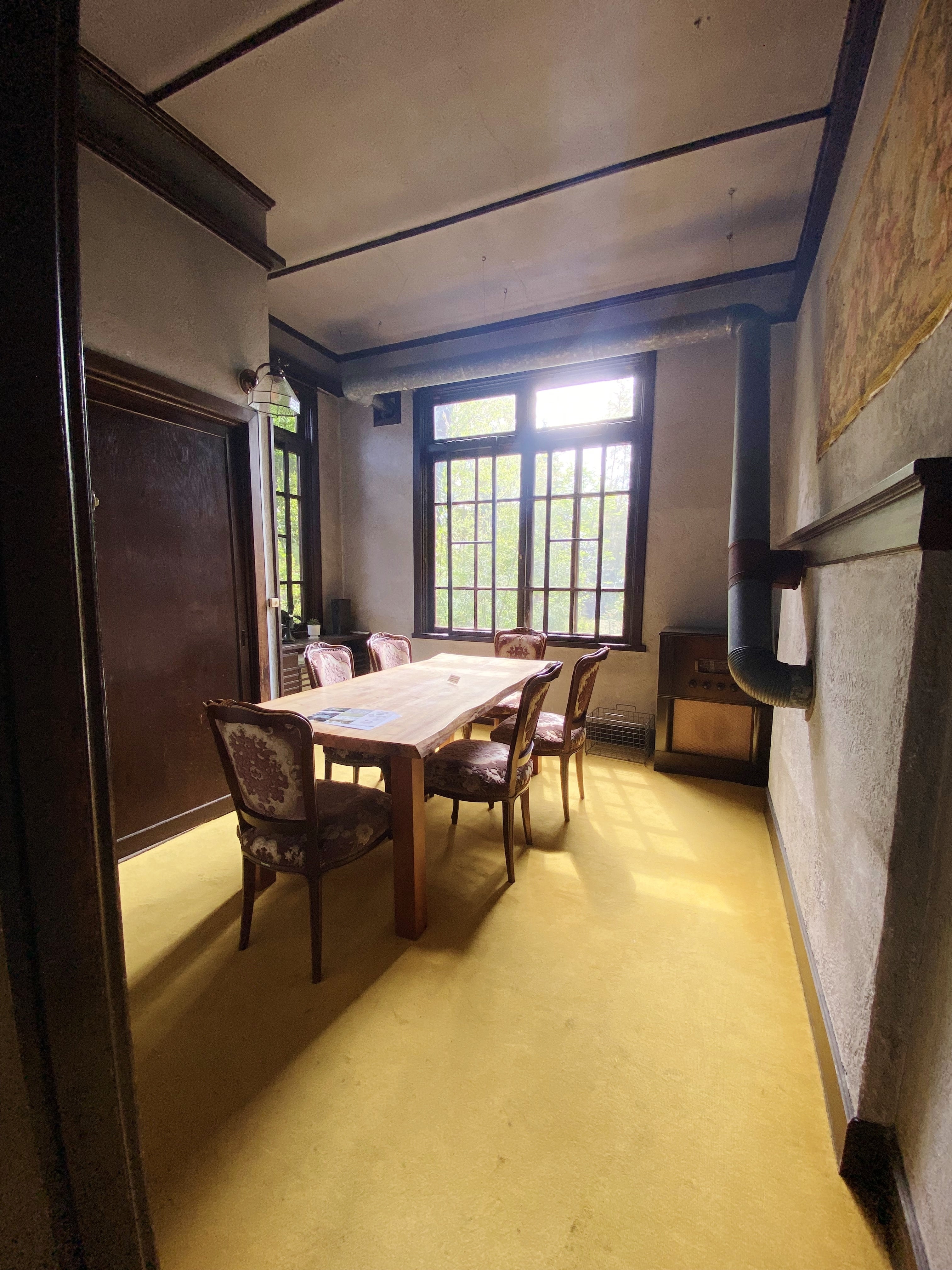 その想いを形にしたのが、「カフェ おきもと」です。洋館を利用して、令和2年10月にオープンしました。建てられた当時のままの姿が残っていることがこの沖本家住宅の魅力であったため、あえて内装の壁の塗り替え等はほとんど行わず、必要最低限の修繕と清掃のみをしました。一部の椅子は沖本家で使われていた物を利用し、蓄音機や黒電話など、当時の生活に想いを馳せられるような家具・家電をところどころに飾っています。