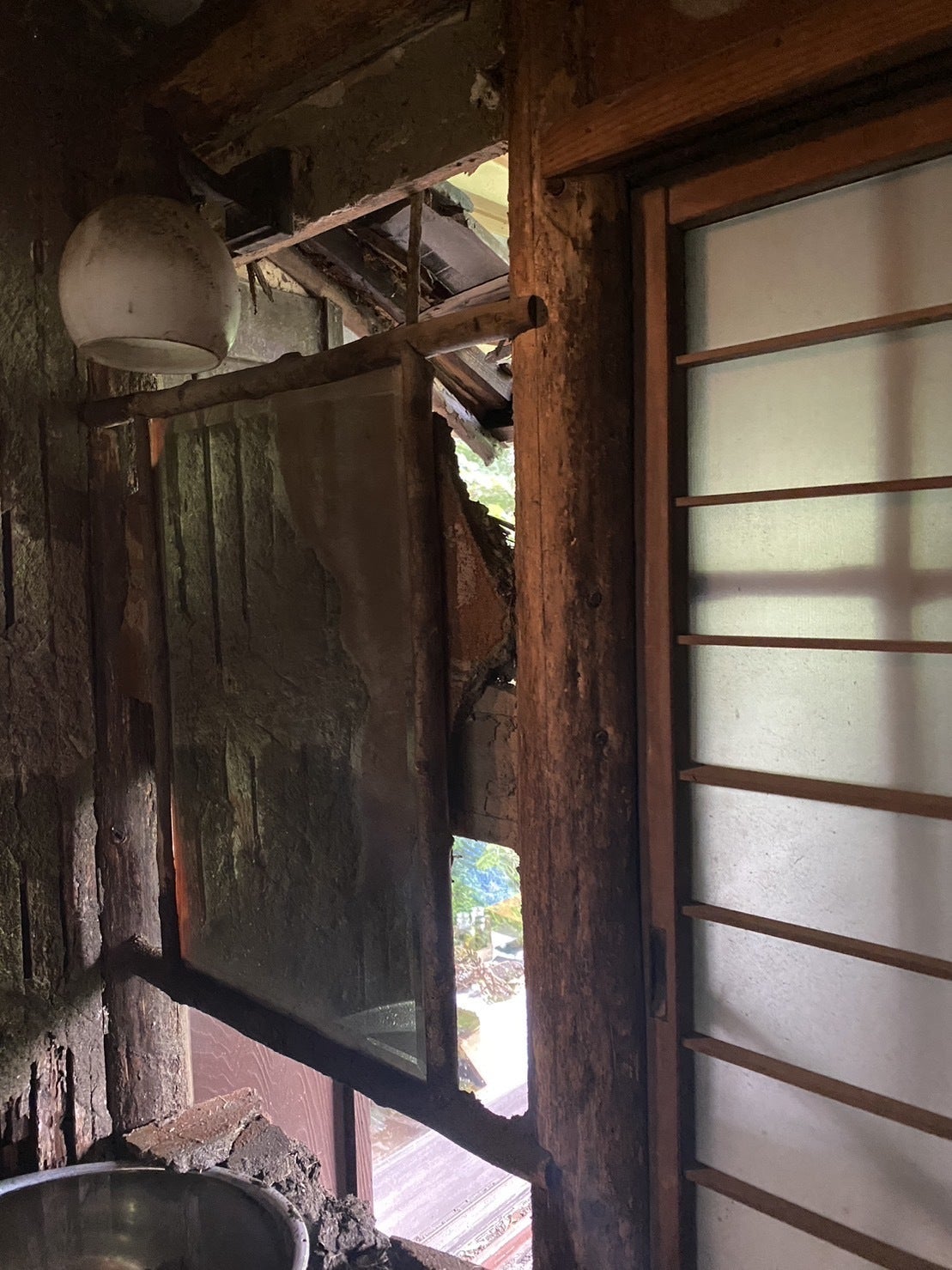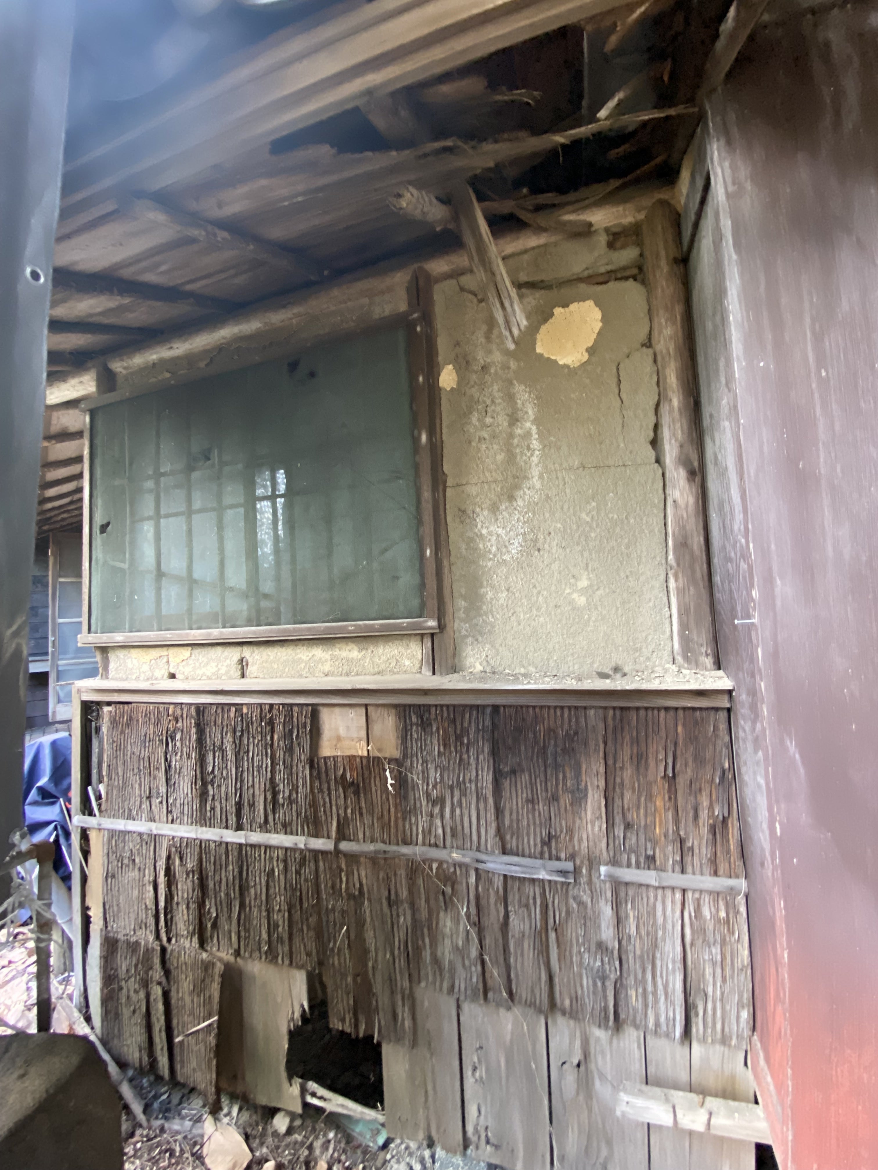 写真でご覧いただいているように、洋館と和館をつなぐ渡り廊下の瓦屋根は数年前の台風で剥がれ落ち、もともとの劣化に雨漏りも加わり、内部の土壁は崩壊してしまっています。洋館も和館もほとんど無修復ですみましたが、渡り廊下はこのままでは自然崩壊しています。この渡り廊下の屋根、壁を修復するために皆様のお力添えをいただけましたら幸いです。
