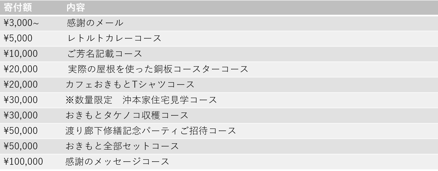 カフェおきもとで提供しているメニューやお土産品、実際に沖本家住宅にお越しいただけるイベントなどをリターンとしてご用意させていただきました。またカフェへの来店が難しい方、ご支援のお気持ちが強い方に向けて、「感謝のメール/メッセージ支援」をご用意いたしました。