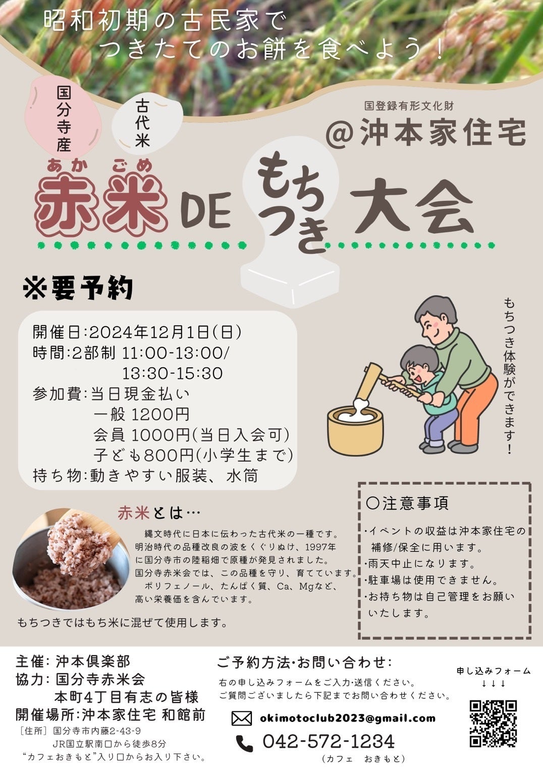 2024/11/17 20:00こんばんは!沖本家住宅クラウドファンディングスタッフです。この度、沖本倶楽部が主催となり、沖本家住宅にてお餅つき会のイベントを開催する運びとなりましたので、この場をお借りしてお知らせいたします。概要は以下の通りです。活動報告タイトルの通りこの度、赤米DEおもちつき大会を実施します。国分寺市で発見された、縄文時代からの赤米をまぜたおもちをついて食べてみませんか。開催日:2024年12月1日(日)2部制:11:00-13:00 13:30-15:30ご希望の時間をお選び下さい(申し込み状況によって変更の可能性がございます)参加費:一般 :1,000円倶楽部会員:800円(当日入会可)こども :500円(小学生以下)参加希望の方は↓URLから参加登録いただけますと幸いです。https://docs.google.com/forms/d/e/1FAIpQLSdbeBsPLiKTNwwAQ-UnGojSShVZ0D57GRrgC7NllEPLUkv-IQ/viewformフォームからのご予約をお願いしております。ご協力をお願いいたします。ご注意※雨天中止となります※駐車場は使用できません※持ち物の管理に十分お気を付けください☆☆☆☆☆☆☆☆☆☆☆☆☆沖本倶楽部 事務局okimotoclub2023@gmail.com☆☆☆☆☆☆☆☆☆☆☆☆☆2週間後の開催と、開催まで日にちが少ないですが皆様のご参加をクラウドファンディングスタッフ一同も心よりお待ちしております。また沖本家住宅への認知の拡大がさらなる保全活動につながります。誠に勝手ではありますが、本イベントの拡散や、周囲の方々へのお声がけをいただけますと幸いです。今後ともカフェおきもと/沖本家住宅を何卒よろしくお願いいたします。2024年11月17日沖本家住宅クラウドファンディングスタッフ深堀叶星 もっと見る