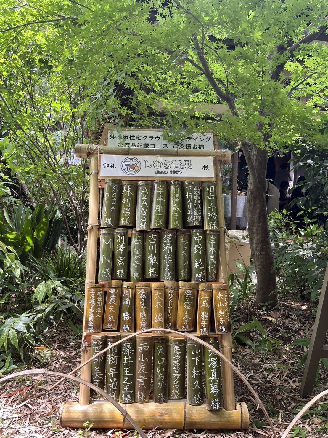 沖本に生えている竹を使った札を使っていたり、写真では見えないですが竹の下には渡り廊下改修工事の際に出てきた廃棄される杉の皮が張られていたり、沖本の思い出の詰まった芳名板となっております。