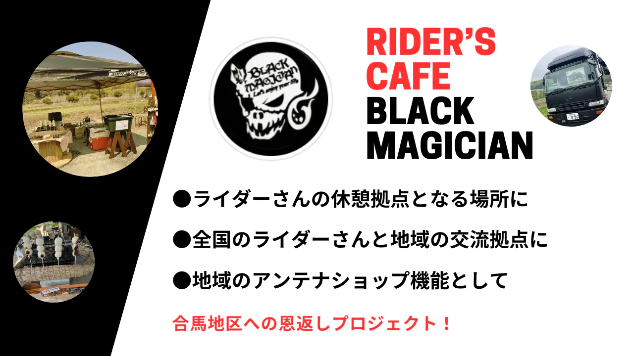 はじめまして、ブラックマジシャン代表の森永美雪と申します。現在は、福岡北九州市の合馬地区を中心に各種イベント開催等をしつつ、合馬地区に【ライダーと地域をつなぐ】ライダーズカフェのオープンを目指し、日々奮闘中です。