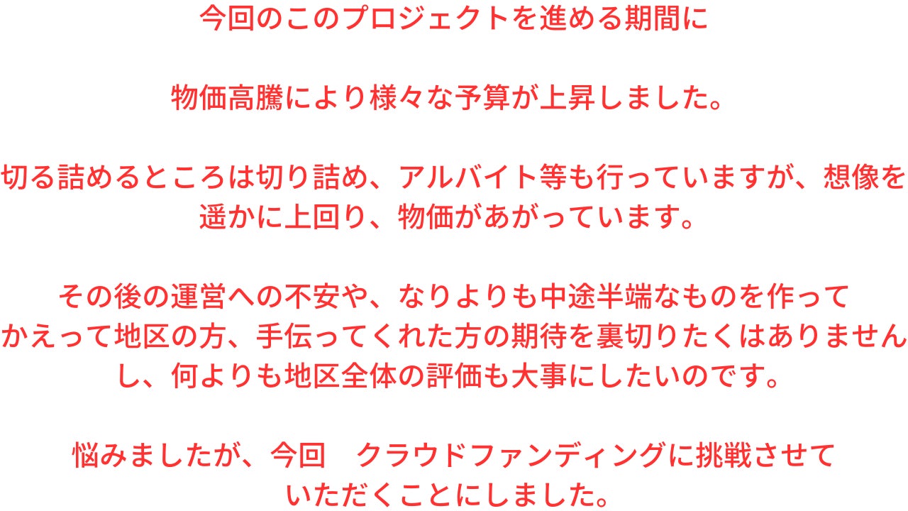 しかしこの計画、地域の為に長く継続させる信念は貫く決意です。