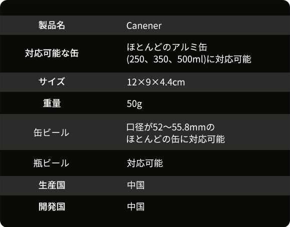 缶切り「Canener」は、市販の半分以上の缶(250、350、500ml)に対応している便利なツールです。自分の好みに合ったビールサイズで、おいしいビールを楽しんでください。