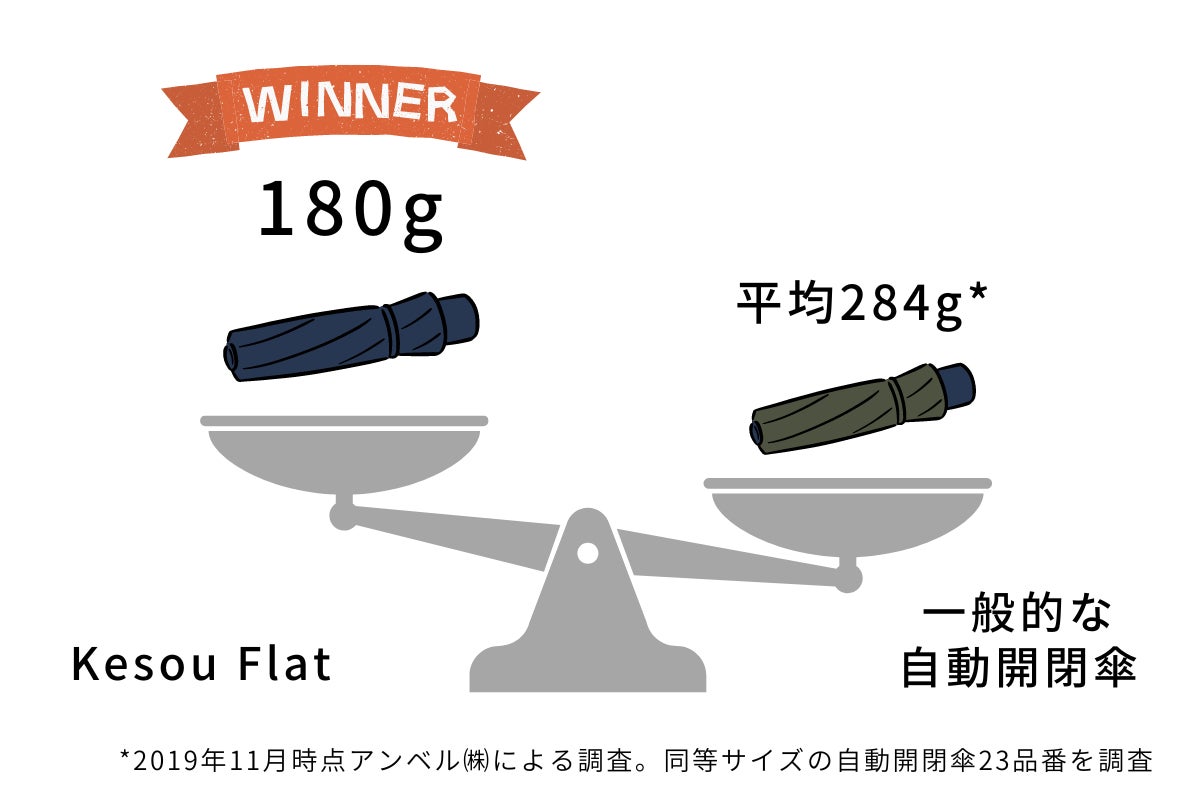 Kesou Flatは、自動開閉傘なのに、180gという軽さ。