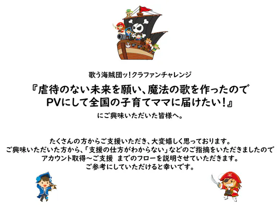 2018/03/06 13:50歌う海賊団ッ! みんなで子育て応援ソングを作りあげよう!クラファンチャレンジ! 『虐待のない未来を願い、魔法の歌を作ったので PVにして全国の子育てママに届けたい!』 歌う海賊団ッ!「クラファンチャレンジ 事務局」からのお知らせです。 プロジェクトがスタートし、たくさんの方々からのご支援をいただきまして大変嬉しく思っております。 ご興味いだいた方から、「支援の仕方がわからない」、「アカウントってなに?」などのご指摘をいただきましたので、「アカウント取得~ご支援までのフロー」をご説明させていただきます。 長文となりますが、以下をご参考にしていただけると幸いです。 CAMPFIREではじめてご支援いただく方のフローは、大まかにいうと STEP.1:CAMPFIREのアカウントを取得いただく。 STEP.2:取得いただいたアカウントからサイトにログイン、リターンを選択いただきお支 払いする となっております。 ▼アカウント取得について CAMPFIREのアカウントが無ければ、プロジェクトの支援はできません。 お手数をおかけしてしまいますが、まずはアカウント取得をお願いいたします。 アカウントはメールアドレスや、お使いのSNSアカウントから取得いただけます。 一度、アカウントを取得いただければ、他の方のプロジェクトも支援可能です。 ▼リターン選択・お支払いについて 任意のプロジェクトをお選びいただき、お支払い方法などをご登録いただきます。 お支払いの方法は、クレジットカード払い、コンビニ払い、銀行振込、auかんたん決済(KDDIをご利用の方のみ)、Paidy(コンビニ後払い)、Softbankスマート支払い(Softbankをご利用の方のみ)となっております。 詳細についてはCAMPFIRE内のヘルプページ、パトロン様向け情報などもご参照ください。 ※支払い方法がわからない!という方は、「コンビニ払い」で選択いただき、後ほど指定のお近くのコンビニレジにて、CAMPFIREから届いたメールを見せながら金額をお支払いいただくと簡単に手続きできます。 子育てママパパを応援していくため、 皆様のご支援をお待ちしております。 もっと見る