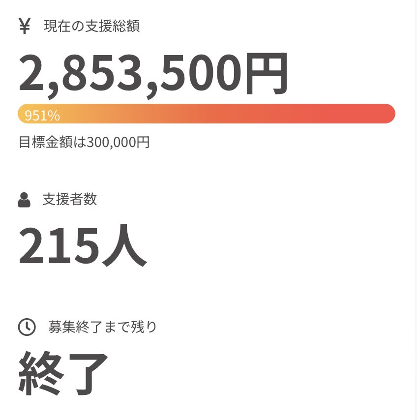 【支援者215名、285万円突破、達成率951%】を達成することが出来ました。
