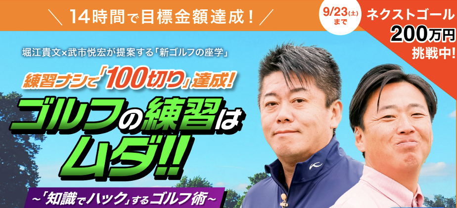 <堀江貴文>:僕は本当に練習が嫌いだ。そこで、僕がいつも教えてもらってる武市プロとコラボし、練習しないでも100ギリできる!ゴルフ上達法を学べるレクチャー動画と書籍を作りました。本当に1人で、コーチもつけずに打ちっぱなしで、100球200球打ってても、上手くなんない。「とりあえず、これを抑えれば''必ず''上達するよ」っていう話を動画内で、たくさん説明したんですけど、みなさんでも絶対できる。そんな難しいことは言ってないです。大切なのは、しっかり頭で理解すること。この動画と書籍を見れば、今100ギリ出来ていない人でも、100ギリすることができる最短ルートだ。武市メソッドへ、いってらっしゃい!