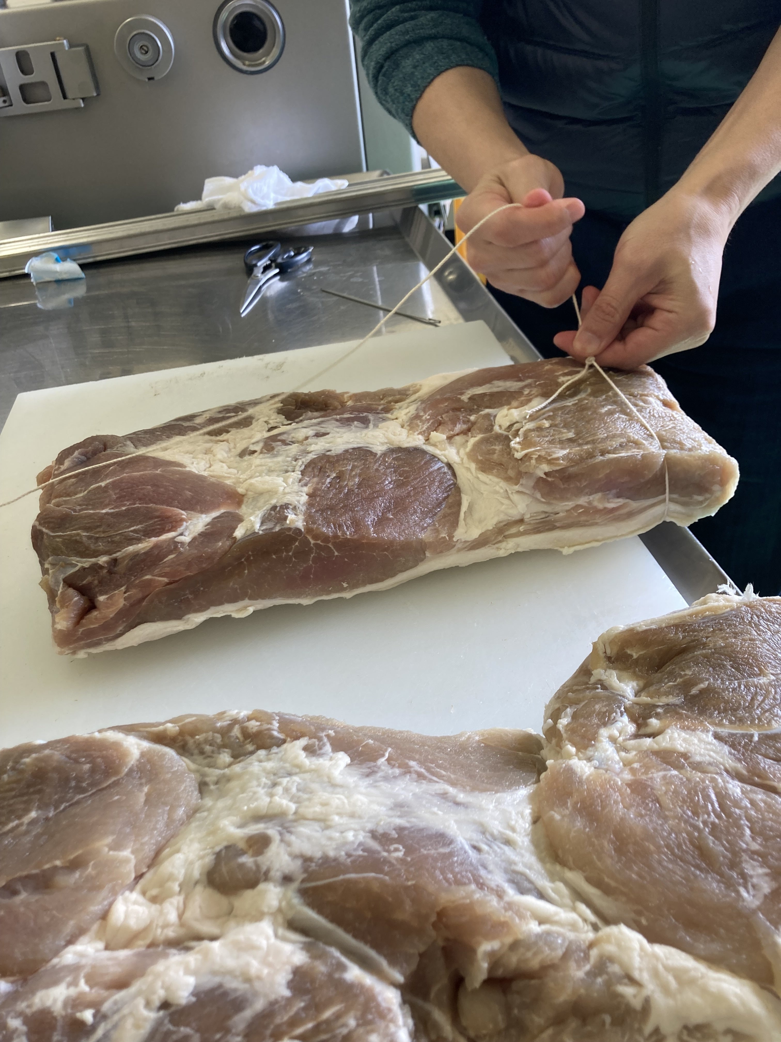 こちらは以前漬け込んだ外モモです。吊り下げられるよう紐で縛っていきます。スライスした時になるべく同じくらいの大きさになるように肉を整形して長四角にカットしました。骨もないので、スライスしやすいんじゃないかなぁと思います。ただ、気になることがありまして、やはり深海塩は塩甘なのか、少しぬめりが出ています。もしかしたら失敗作となってしまうかもしれません。ポジティブに捉えれば、それが分かったと言うのが一歩前進だと思いますので、引き続き応援よろしくお願いします!