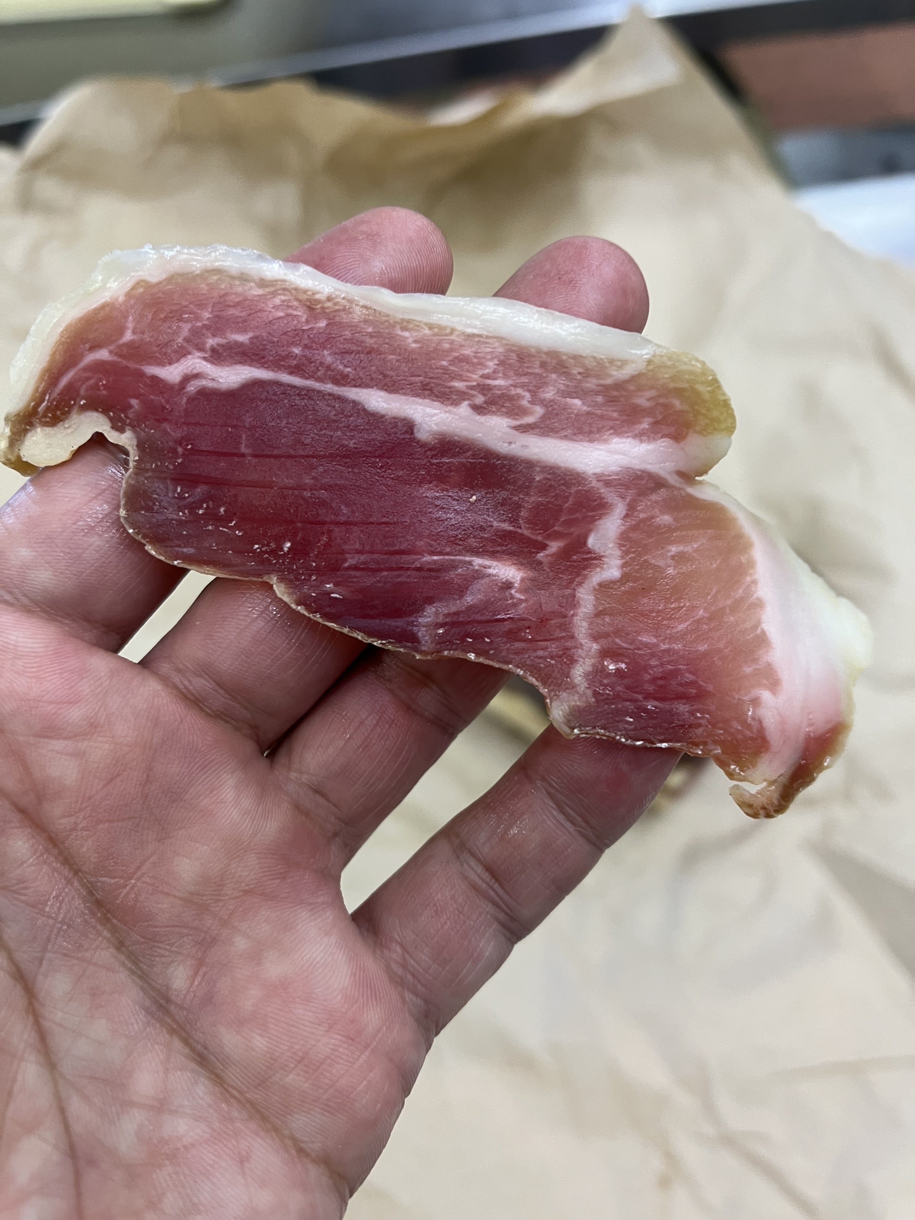 試作品が完成しました!が、失敗作となりました。この生ハムでは多くの人に満足していただけないと判断して、失敗作とさせていただきます。なお、これからも成功か失敗かは私が判断します。笑今回の反省点は、塩漬け期間を長く取りすぎたかなというところと、十分に良い乾燥ができなかったところかなと思っています。ただ、味はびっくりするくらい美味しかったです。一発目で「味が美味い」を引けたのは本当に運が良いです。これをベースにトライしていければと思っています!