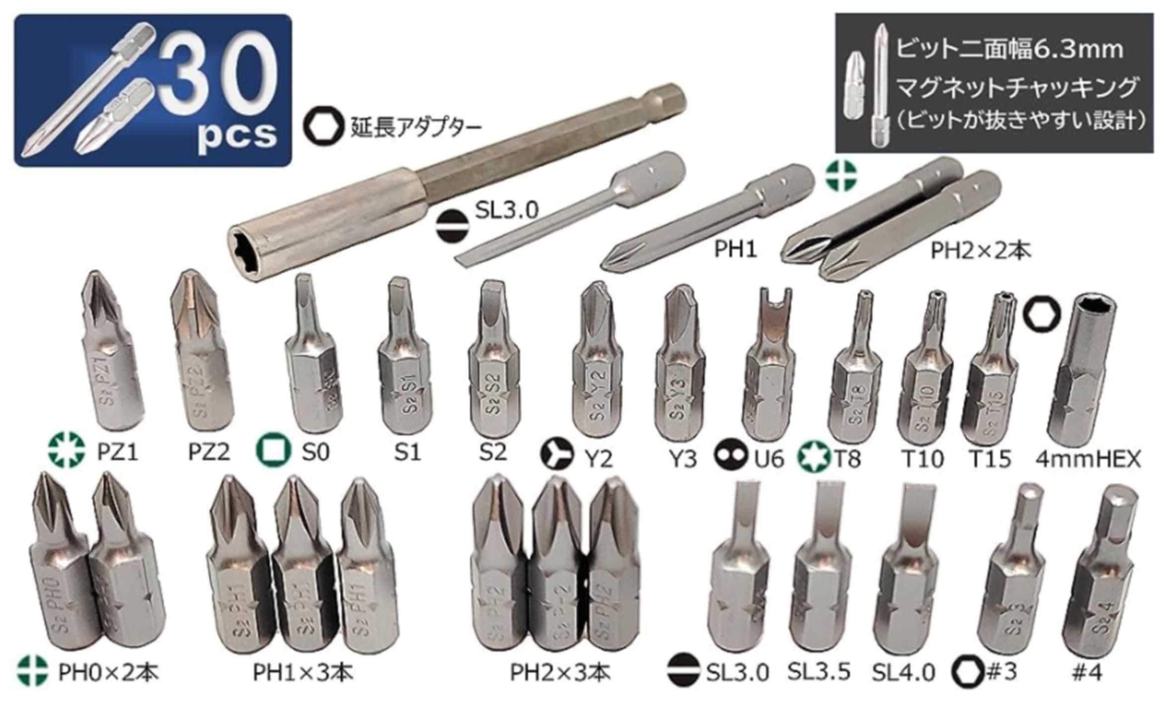 →A2:ビット全長が短いショートタイプを多く付属しているため、磁力を強くすると、手でビットが