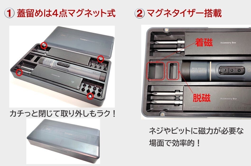 →A2:ビット全長が短いショートタイプを多く付属しているため、磁力を強くすると、手でビットが