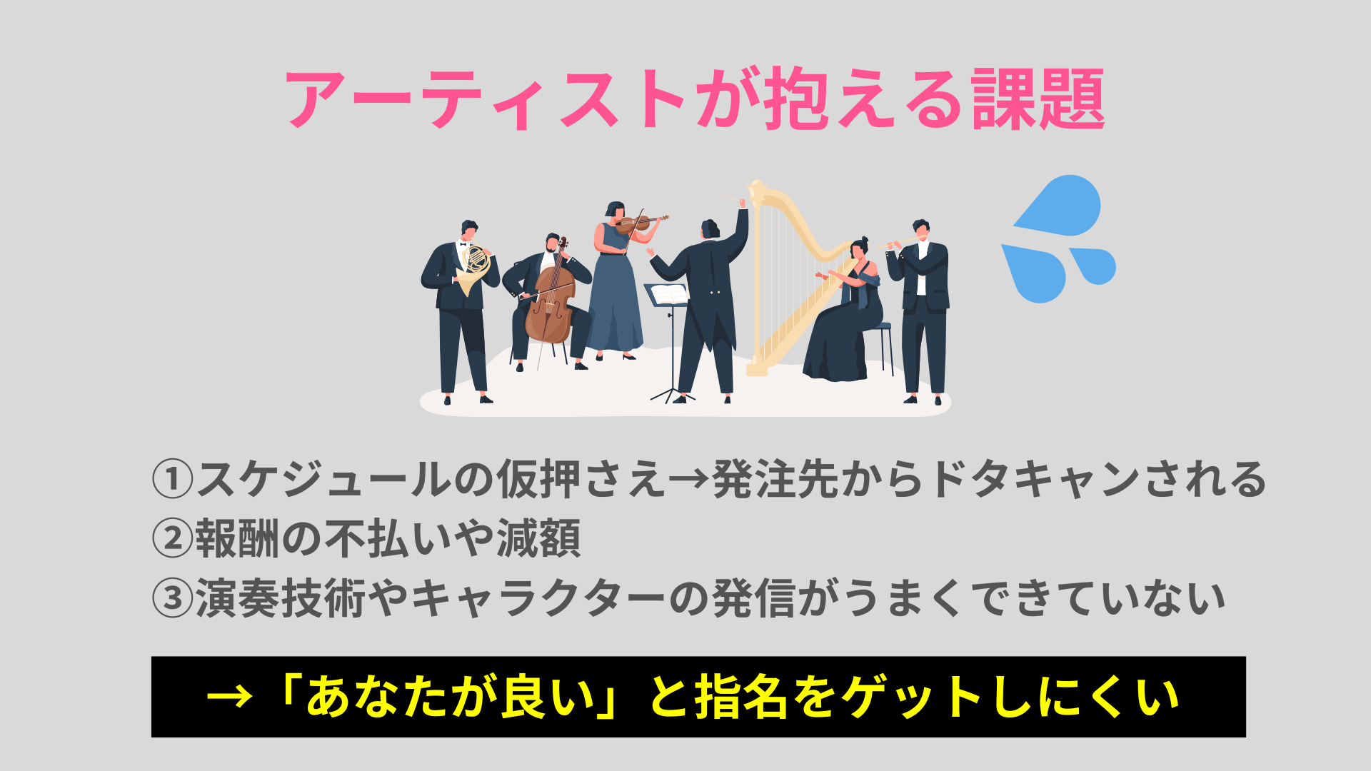 私は、日本国内で「エンターテインメント・クラシック®をもっと身近に!」をコンセプトに、日本全国に音楽の感動をお届けする活動をしています。しかし、500名以上のアーティストが登録している音楽事務所を経営する中で、大きな課題を実感しています。