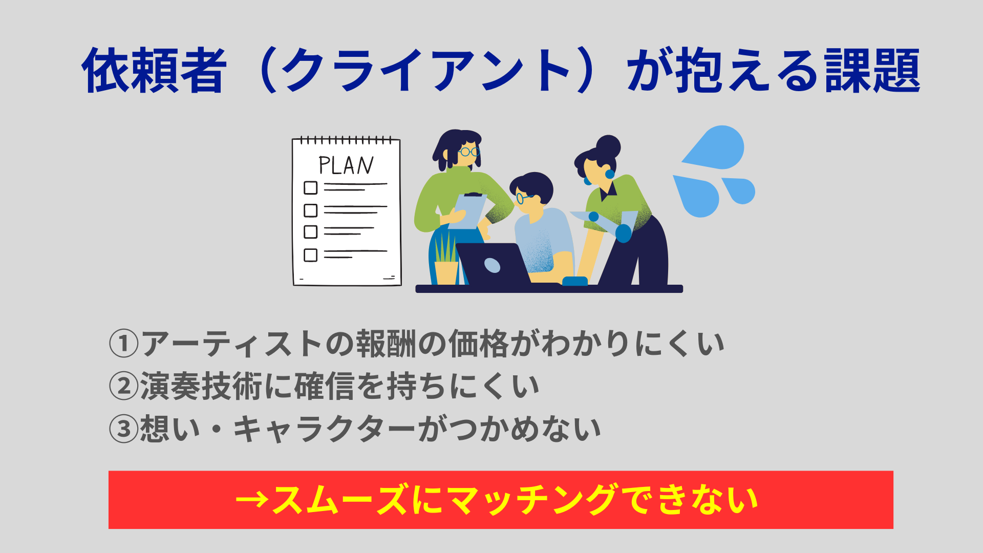 こういった経緯から、「アーティストとクライアントのマッチングがスムーズにいくWebサイトを作って、この問題を解消したい」と思うようになったのです。