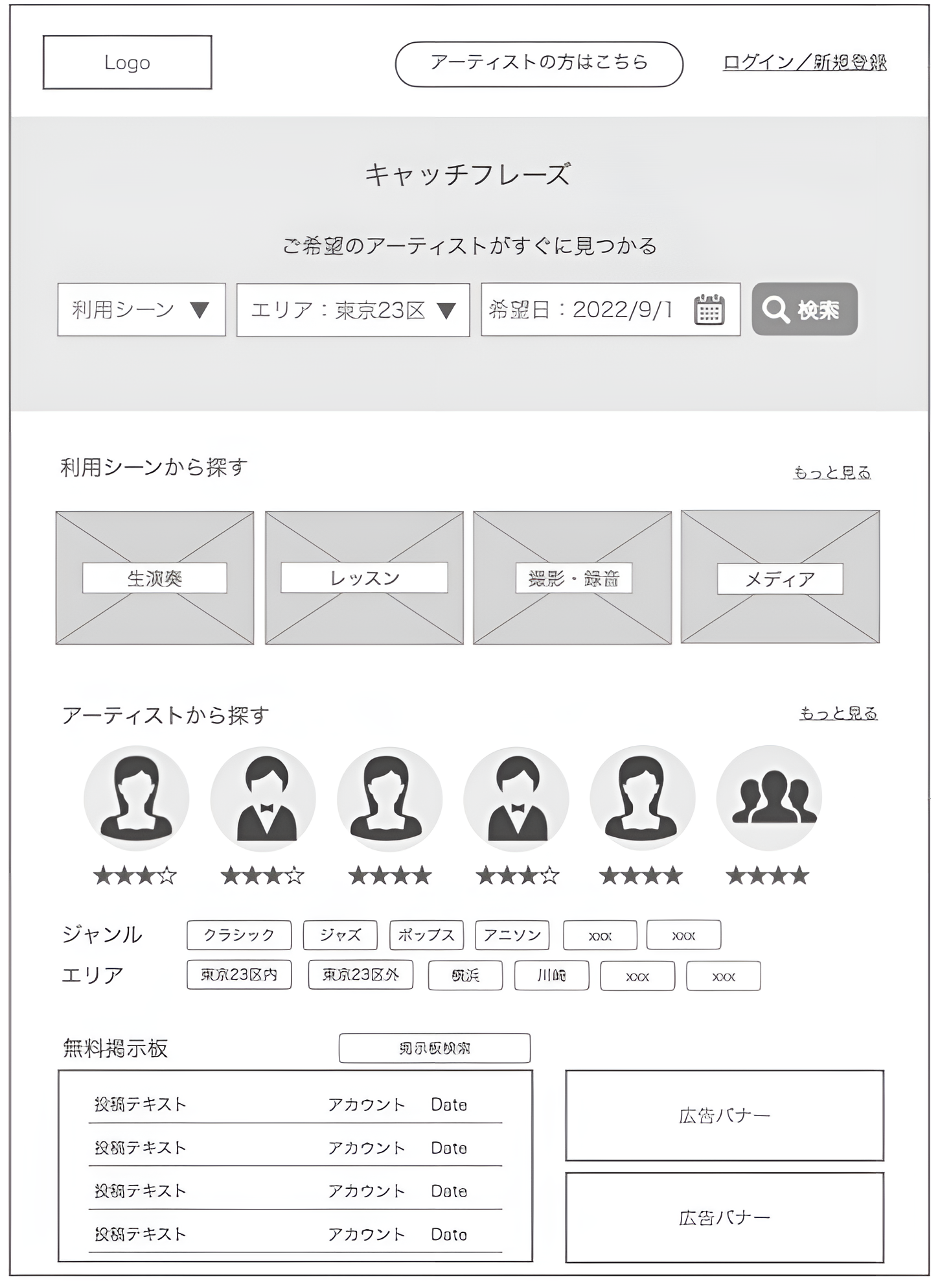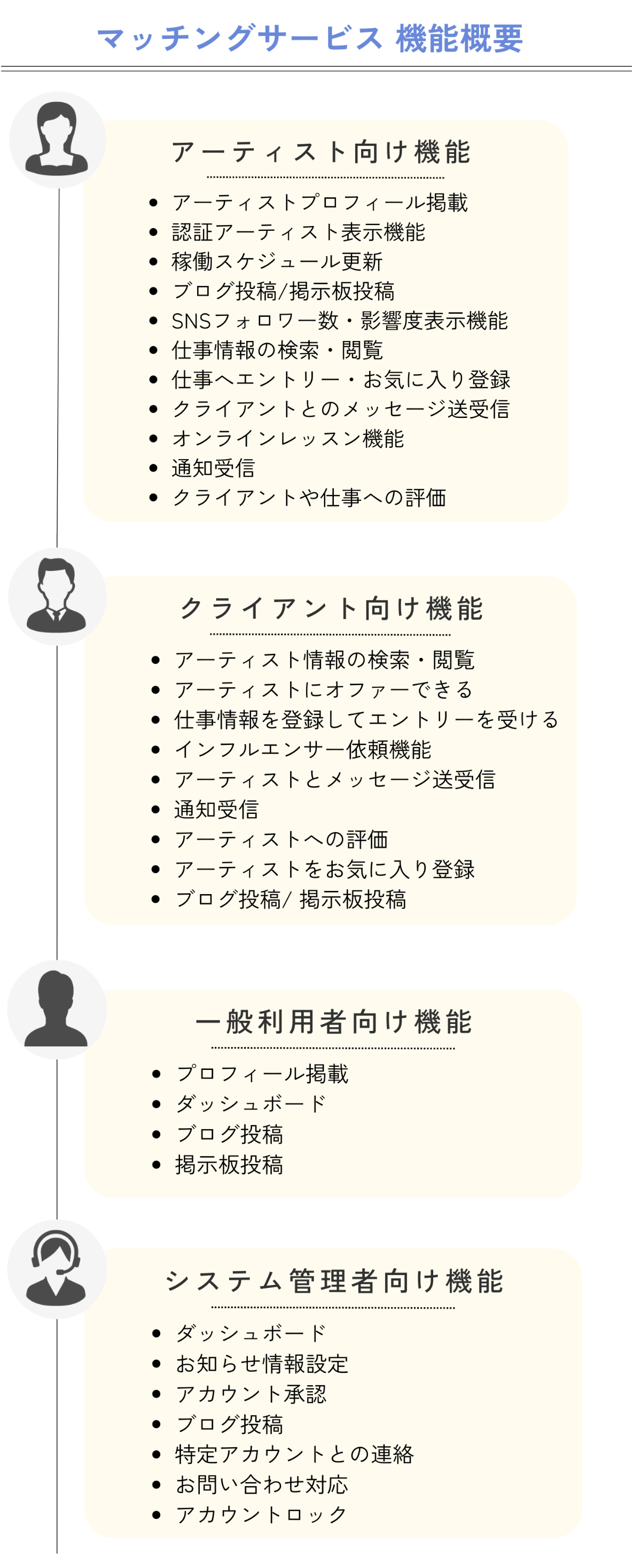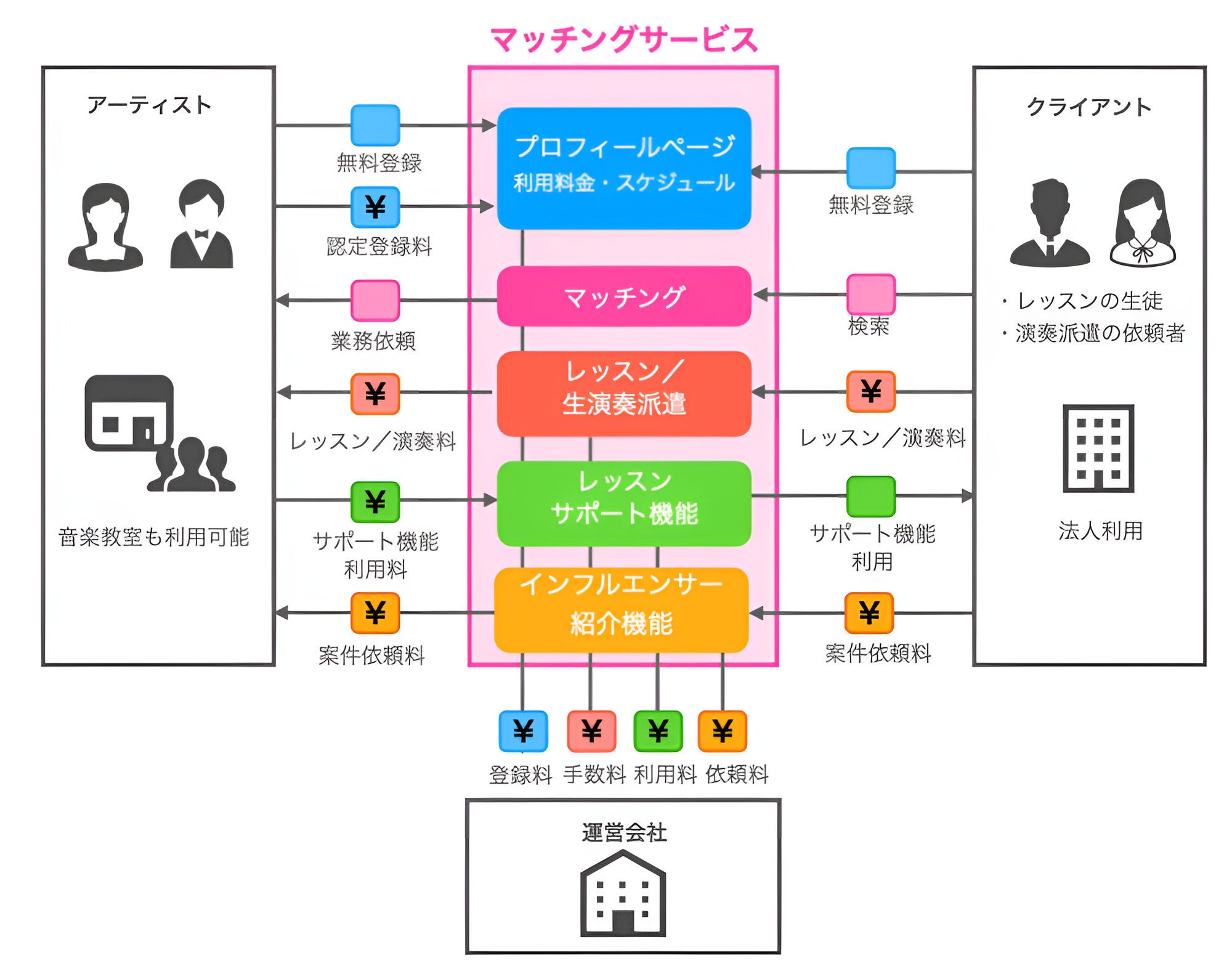 アーティスト(演奏家)と、音楽系の仕事を依頼するクライアント(音楽レッスンや演奏派遣、インフルエンサー案件)をマッチングする機能を提供するマッチングサービスです。