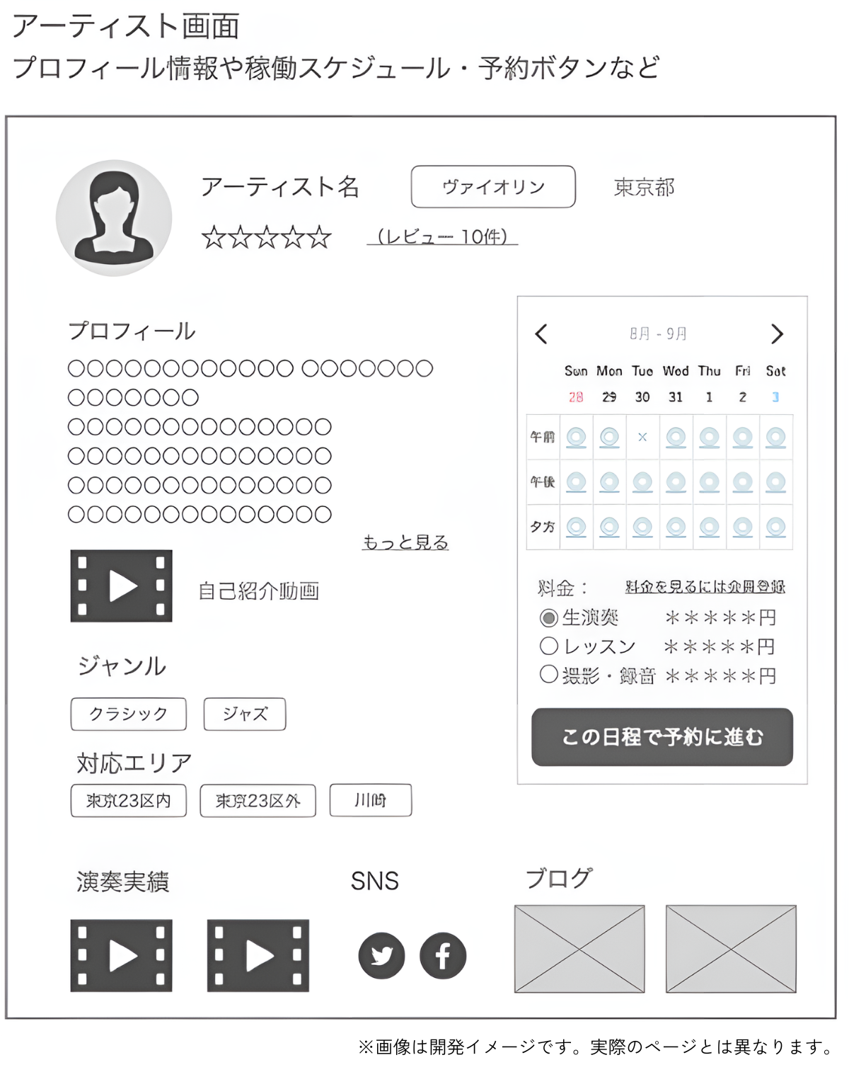 アーティストは無料でサービスに登録でき、プロフィールページを持つことができます。クライアントはアーティスト検索機能を利用して、仕事の依頼やレッスン受講したいアーティストを探すことができ、システムを介してマッチングが可能。