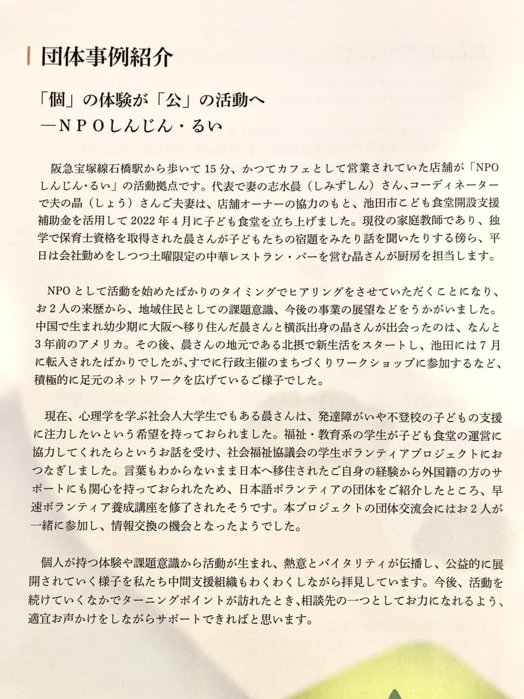 こんにちは!『NPO しんじん・るい』です。昨年から参加させて頂いた「北摂ともにプロジェクト」の活動報告冊子に掲載いただきました。「北摂ともにプロジェクト」は北摂エリアの活動団体向けに団体の魅力再発見や困りごとの解決など、中間支援組織の皆さまにご支援いただける事業です。池田市の団体から私達を選出して頂き大変光栄に思っております。他市の団体さまとの交流機会も頂き活動の視野を広めることもできました。貴重な体験に感謝しております。また新たな取り組みにも是非今後もチャレンジさせて頂けたら幸いです。