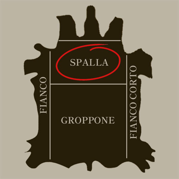 長くお使いいただくために選んだこのレザーは、1枚の革の中でもしっかりとした厚みがあり、繊維の密度が濃い【SPALLA】と呼ばれるショルダーの部分《のみ》を使用したもの。