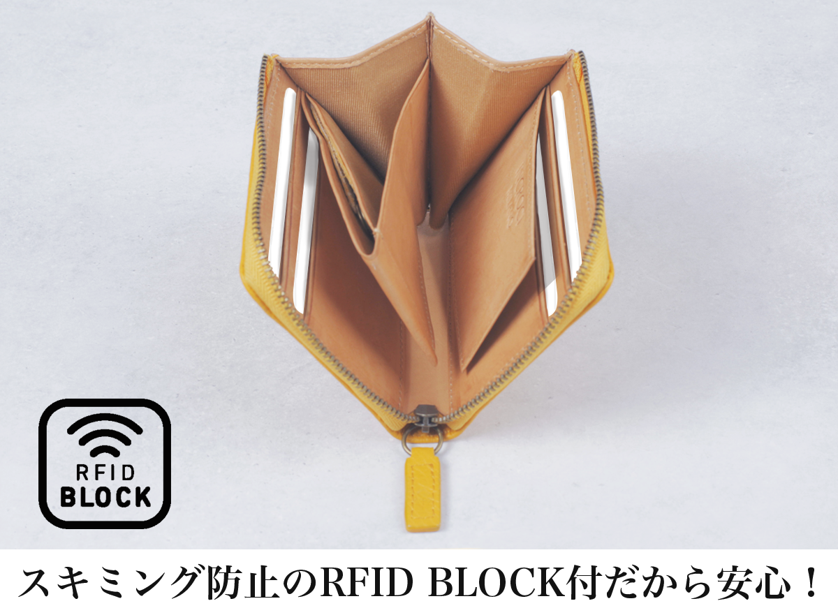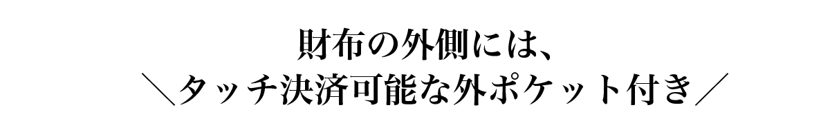 外側のカードポケットは、「タッチ決済」を可能にするため、あえてRFID BLOCK(スキミング防止機能)を付けていません。