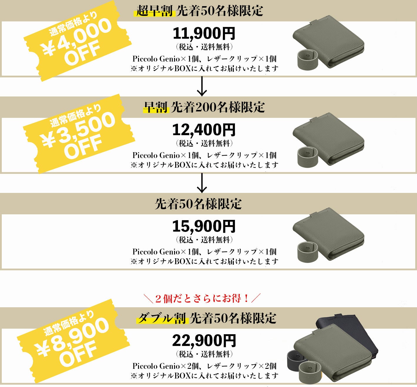 ・財布piccolo genio×2個、レザークリップ×2個※オリジナルBOXに入れて、お届けいたします。