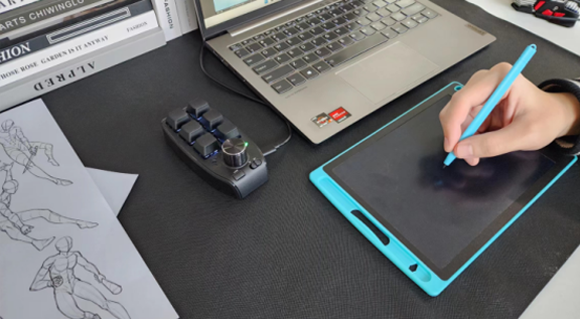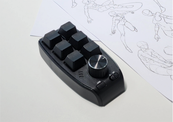 「Mini cukey」にはノブが付いており、左に回す、右に回す、押すの機能をそれぞれ設定でき、例えば、描く際にノブを回すだけでブラシの大きさを調整できるなど、作業効率が上がります。