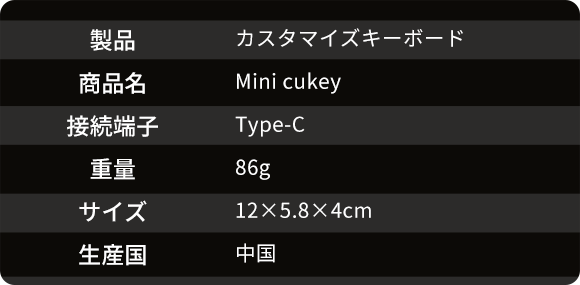 「Mini cukey」は青軸キースイッチを採用し、軽快な打鍵感と、カチッカチッとした小気味いい打鍵音を堪能できます。